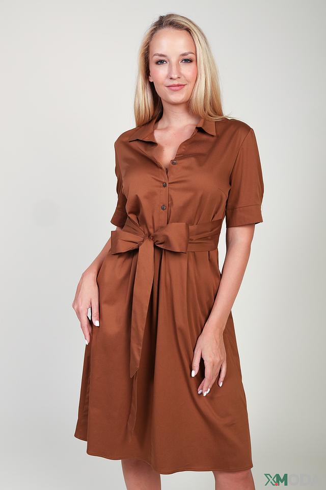 Коричневое платье от Betty and Co – это стильное и комфортное решение для повседневного образа. Приталенный силуэт с акцентом на талии благодаря поясу и воротник-стойка придают платью элегантность и женственность. Состав: хлопок 97%, эластан 3%