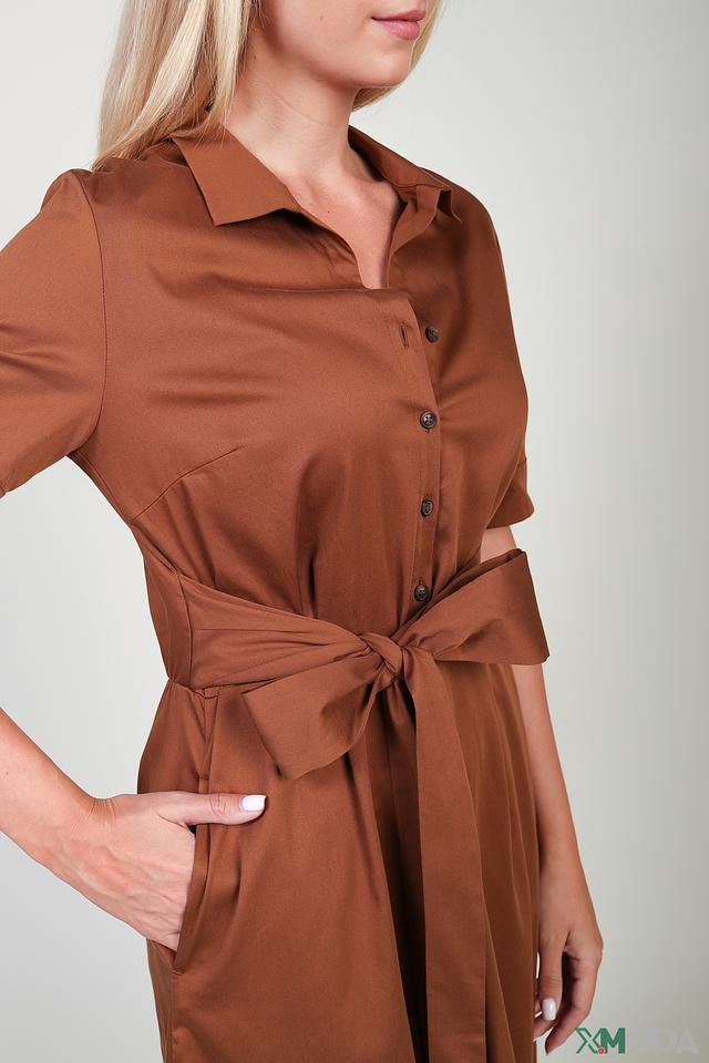 Платье имеет приталенный силуэт, короткие рукава и воротник-стойку. Застежка выполнена на пуговицах. Модель дополнена поясом, который подчеркивает талию и создает женственный силуэт. Платье имеет боковые карманы.