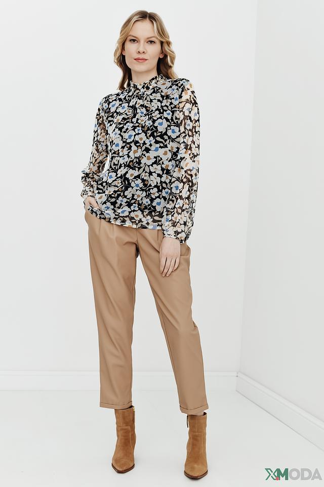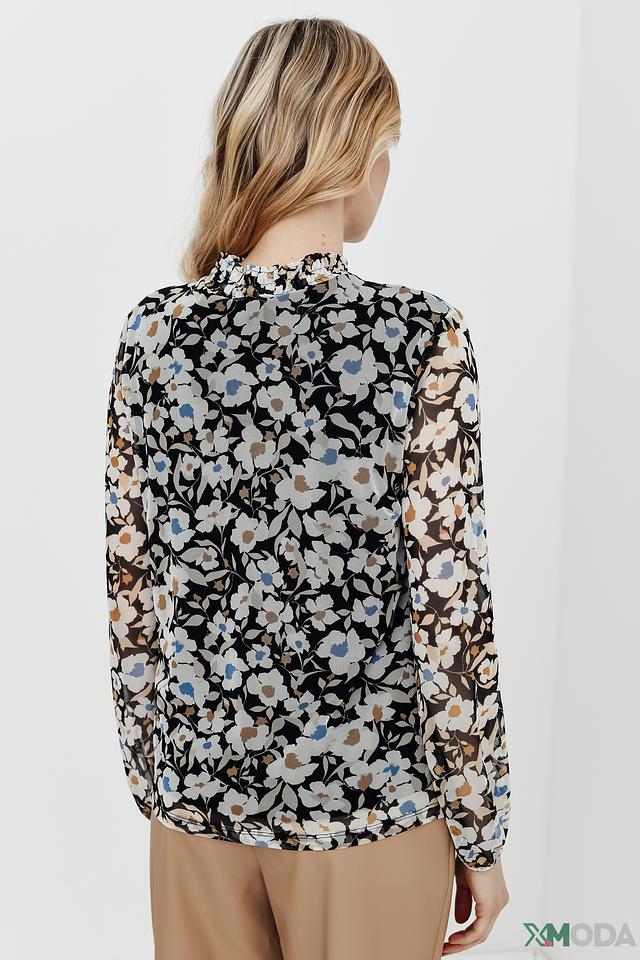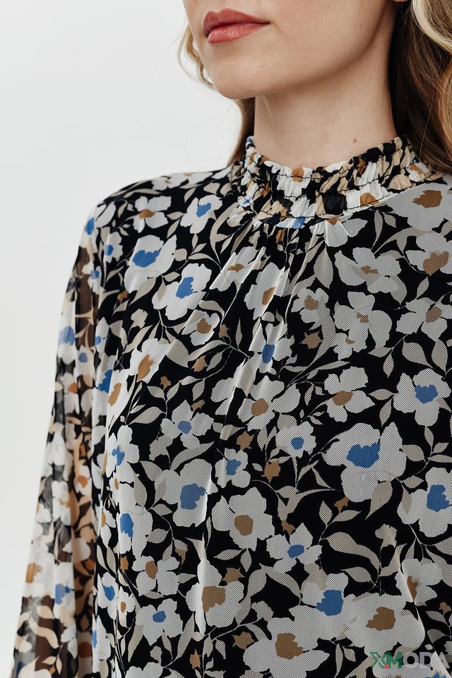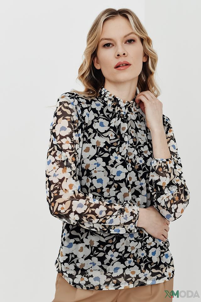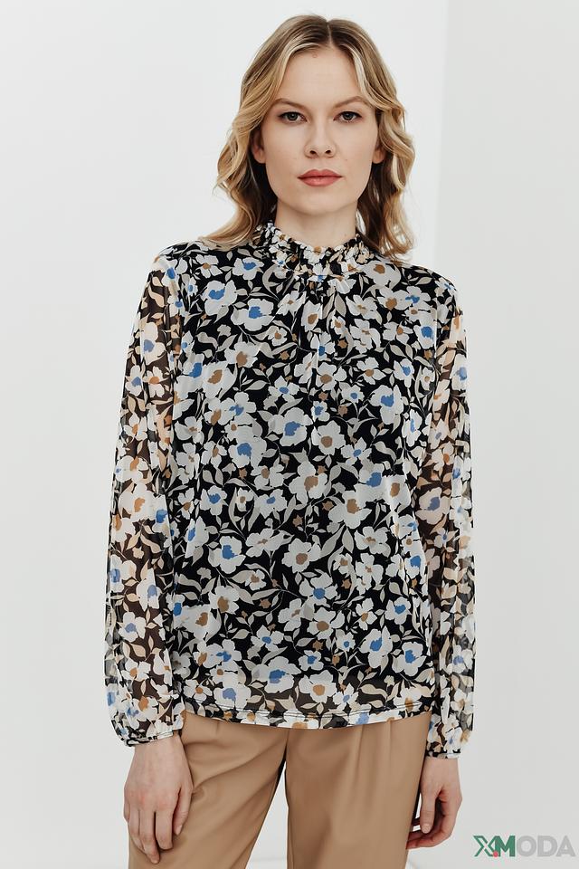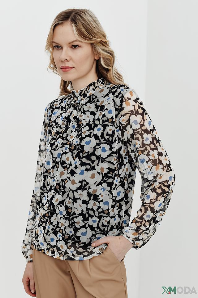 Основной цвет блузы – черный, а ярким акцентом является цветочный принт, выполненный в голубых, белых и бежевых тонах. Рукава блузы длинные, слегка объемные, с манжетами. Вырез горловины оформлен сборкой, что добавляет образу воздушности и легкости.