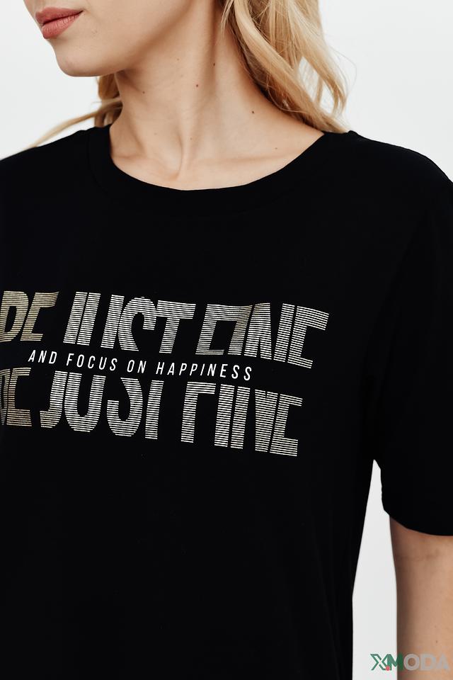 Чёрная футболка Betty and Co с оригинальным принтом – стильная и комфортная базовая вещь. Изготовлена из мягкого хлопка с добавлением эластана для удобства носки и сохранения формы. Идеально сочетается с джинсами и брюками. Состав: хлопок 94%, эластан 6%