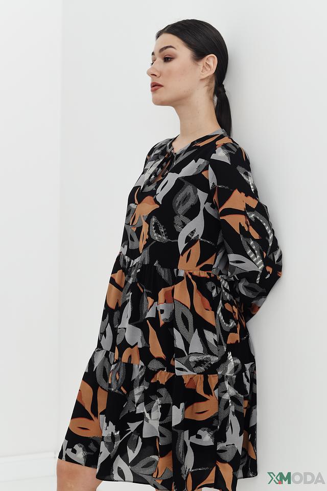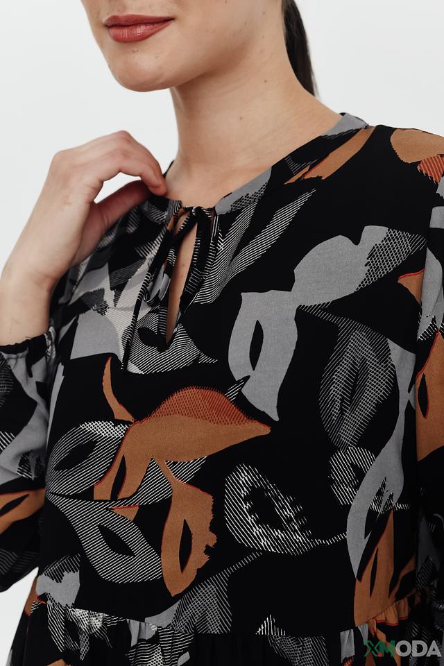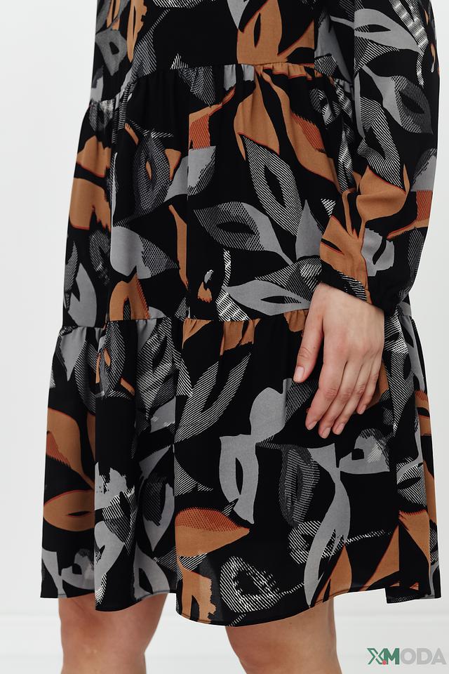 Это элегантное платье от Betty and Co станет прекрасным дополнением вашего гардероба. Платье выполнено в чёрном цвете и украшено ярким цветочным принтом, сочетающим в себе оттенки коричневого, серого и бежевого.