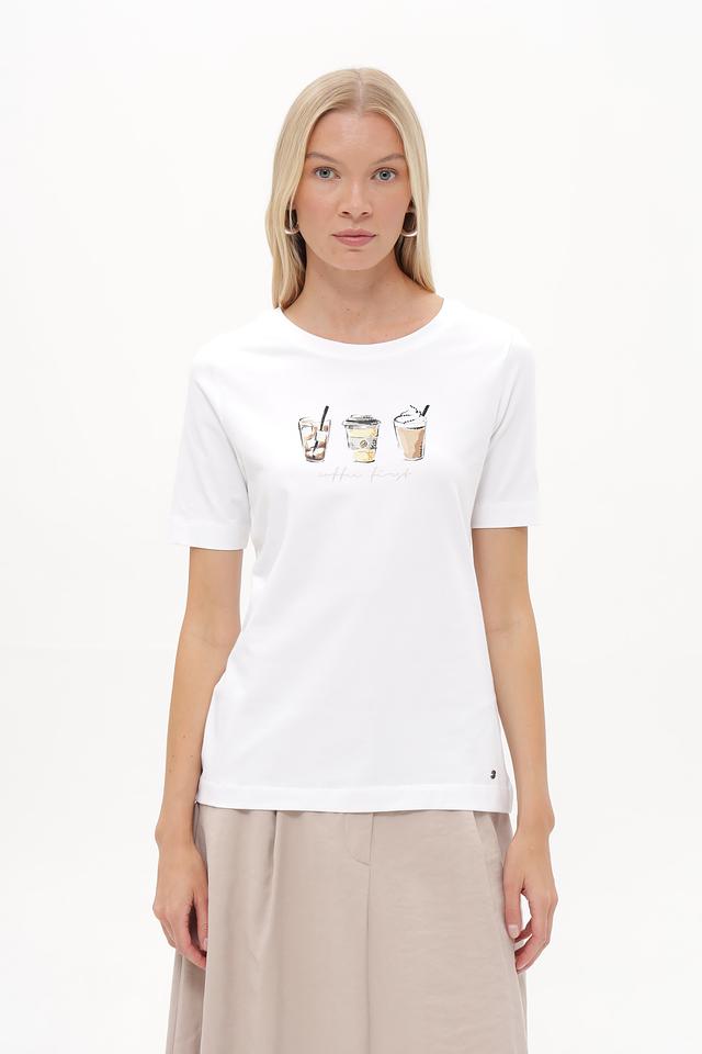 Белая футболка Betty and Co с принтом в виде кофейных напитков. Изготовлена из мягкого хлопка с добавлением эластана для комфорта. Базовая модель на каждый день. Состав: хлопок 95%, эластан 5%