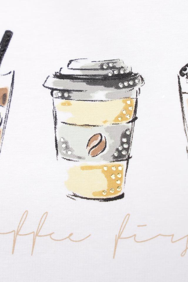 Состав: 95% хлопок, 5% эластан. Эта футболка идеально подходит для создания повседневных образов и легко сочетается с юбками, брюками и джинсами. Стильная и практичная модель для любителей кофе и комфорта.