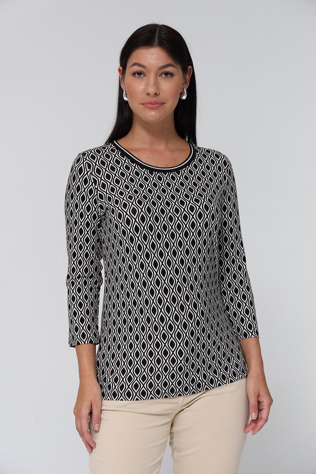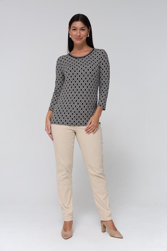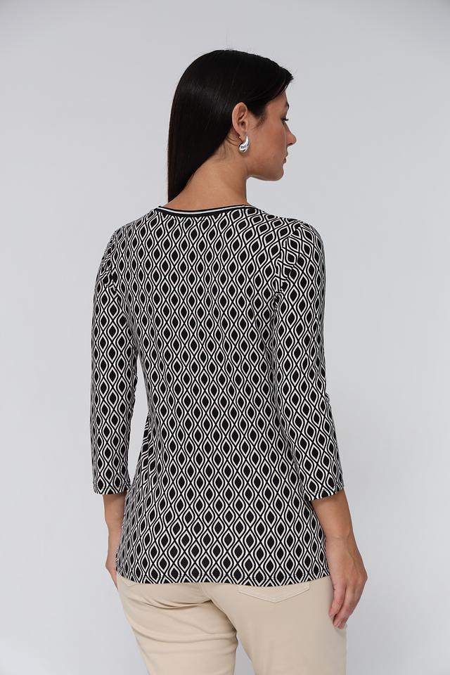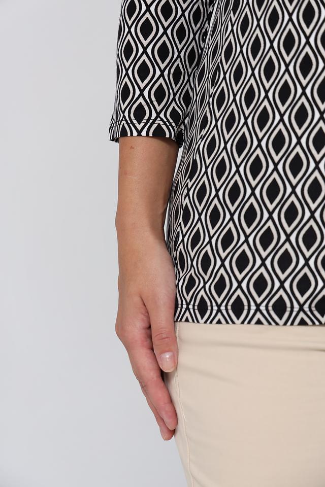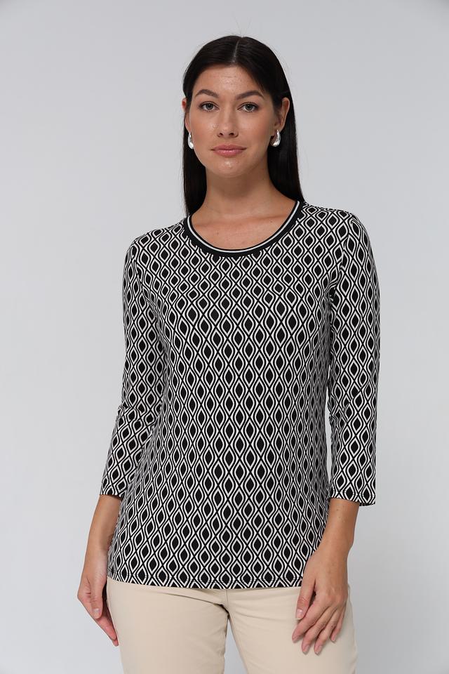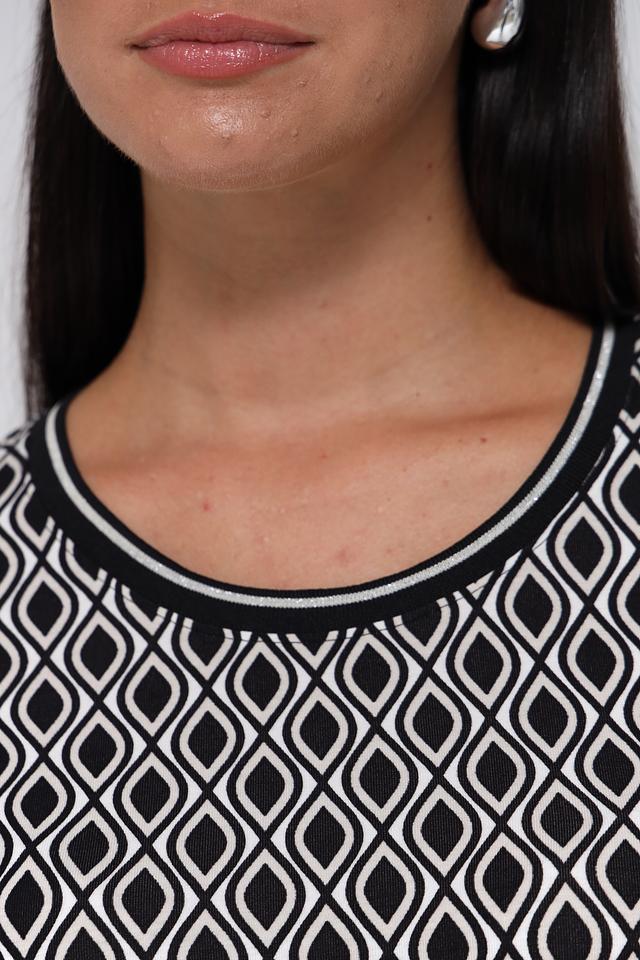 Модель имеет прямой крой и короткий рукав 3/4, что делает ее универсальной для различных образов. Особенностью данной футболки является эффектный геометрический принт в черно-белой гамме, который придаёт ей изысканность и современный вид.