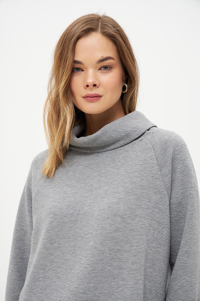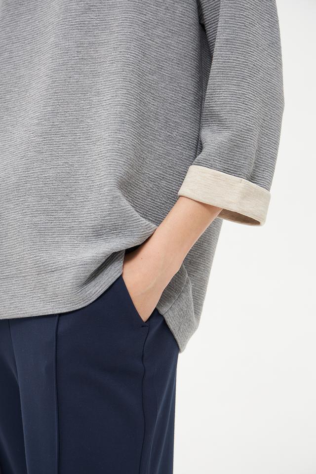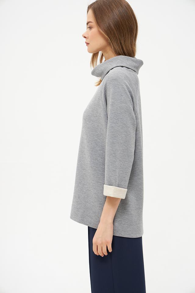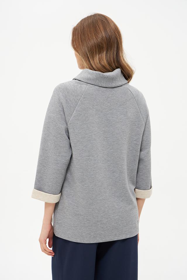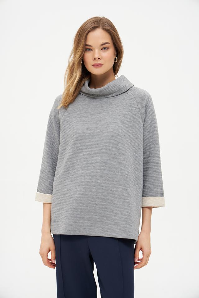 Серый пуловер от Betty Barclay с рукавом 3/4 и воротником-стойкой. Изготовлен из мягкого трикотажа с фактурной поверхностью и отделкой манжет бежевого цвета, станет отличным дополнением к вашему гардеробу. Состав: полиэстер 65%, вискоза 33%, эластан 2%