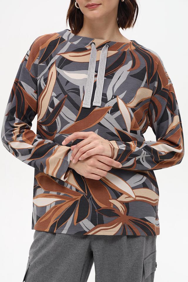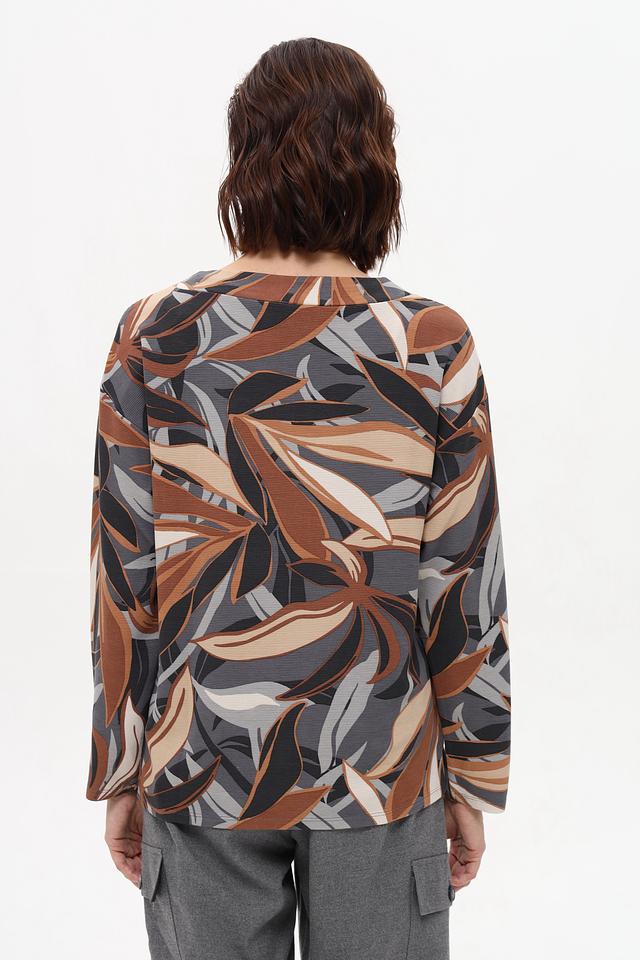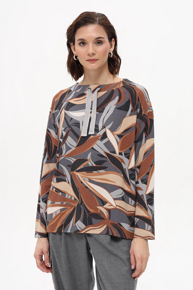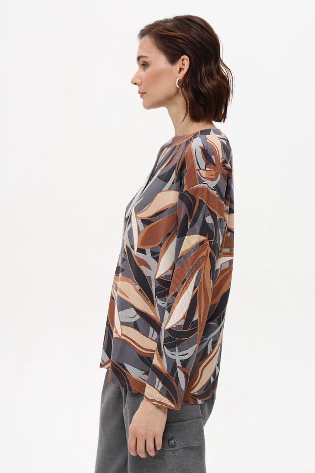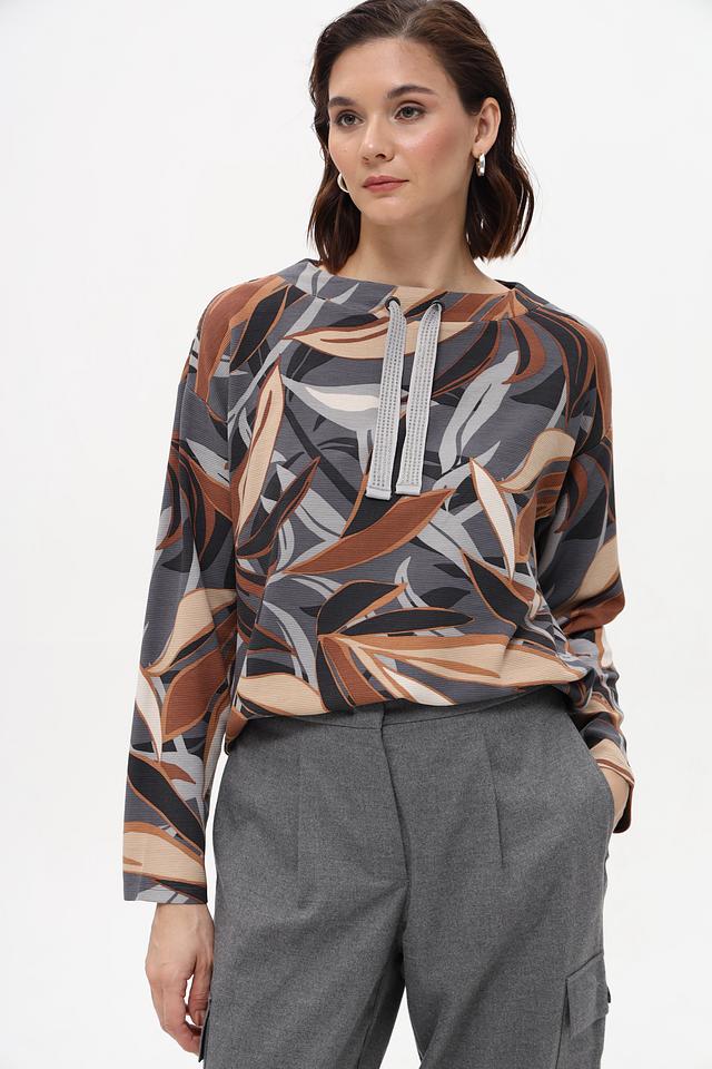 Пуловер имеет свободный крой и длинные рукава, что делает его идеальным для повседневной носки. Привлекательный принт с изображением листьев в оттенках серого, коричневого и бежевого придает изделию особую изысканность.