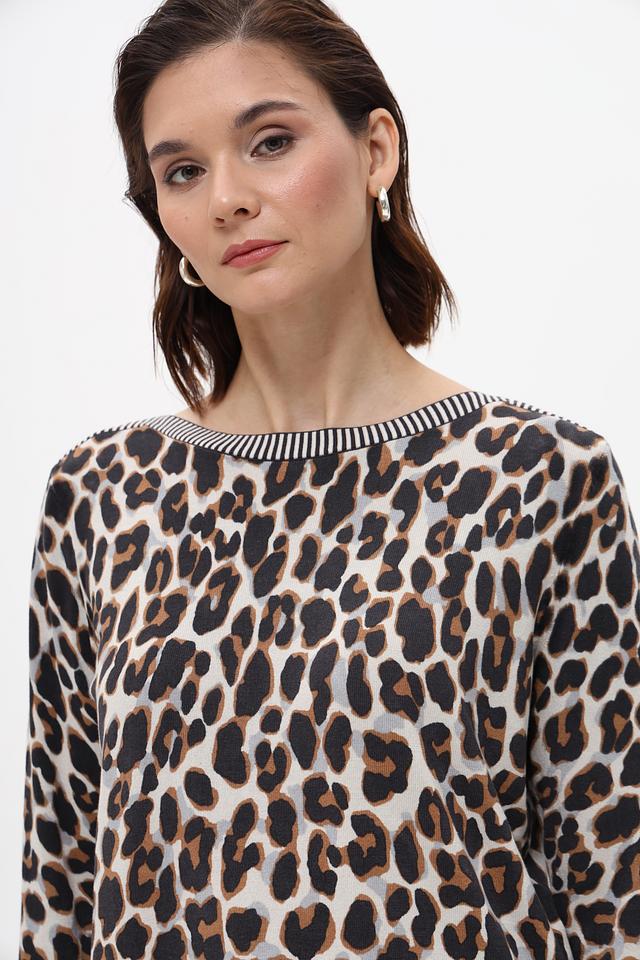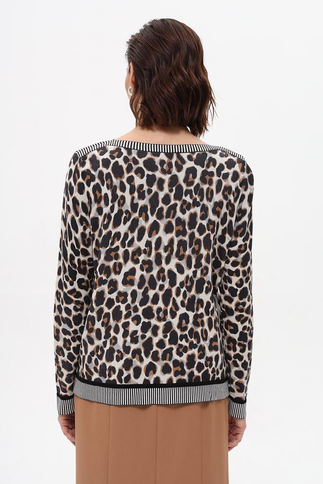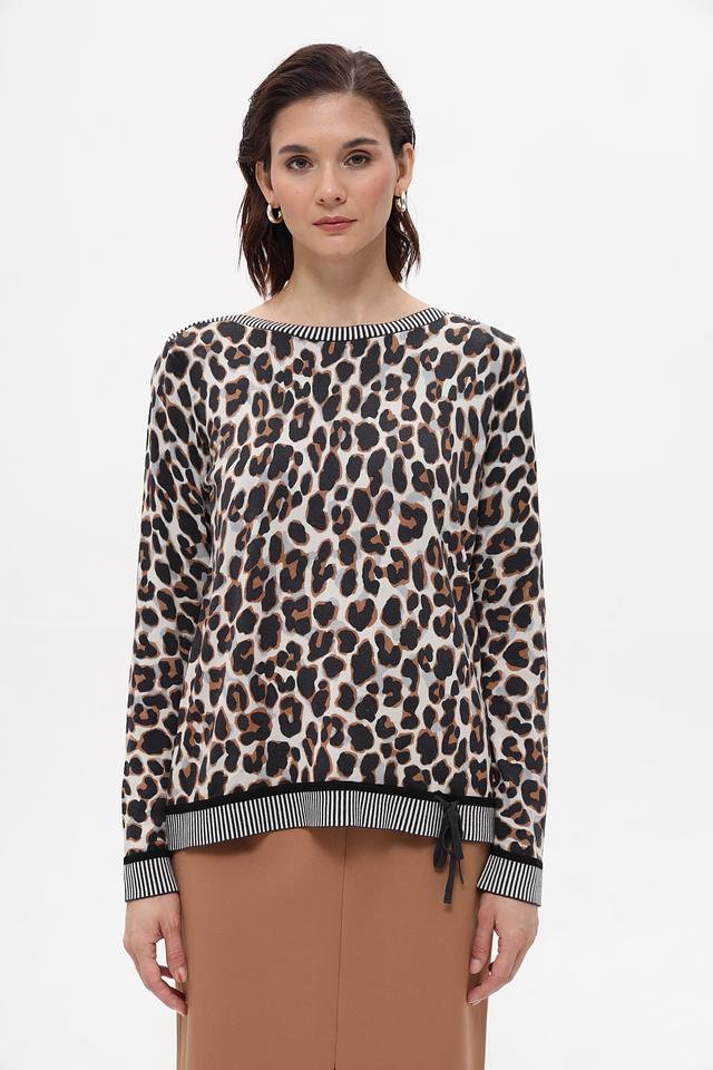 Женский пуловер Betty Barclay с леопардовым принтом и полосатой отделкой. Модель выполнена из мягкой вискозы с добавлением полиамида, что обеспечивает комфорт и приятные тактильные ощущения. Состав: вискоза 80%, полиамид 20%