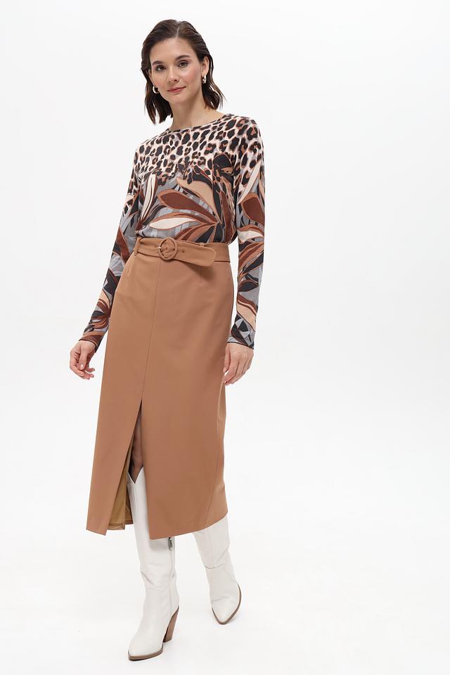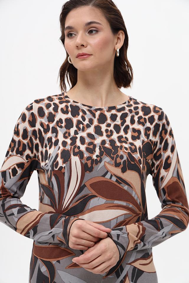 Пуловер имеет свободный крой и длинные рукава. Главная особенность изделия – яркий и запоминающийся принт, сочетающий в себе элементы анималистического рисунка и абстрактных форм. Цветовая гамма включает в себя оттенки коричневого, серого и бежевого, что делает его универсальным и легко сочетаемым с другими вещами.