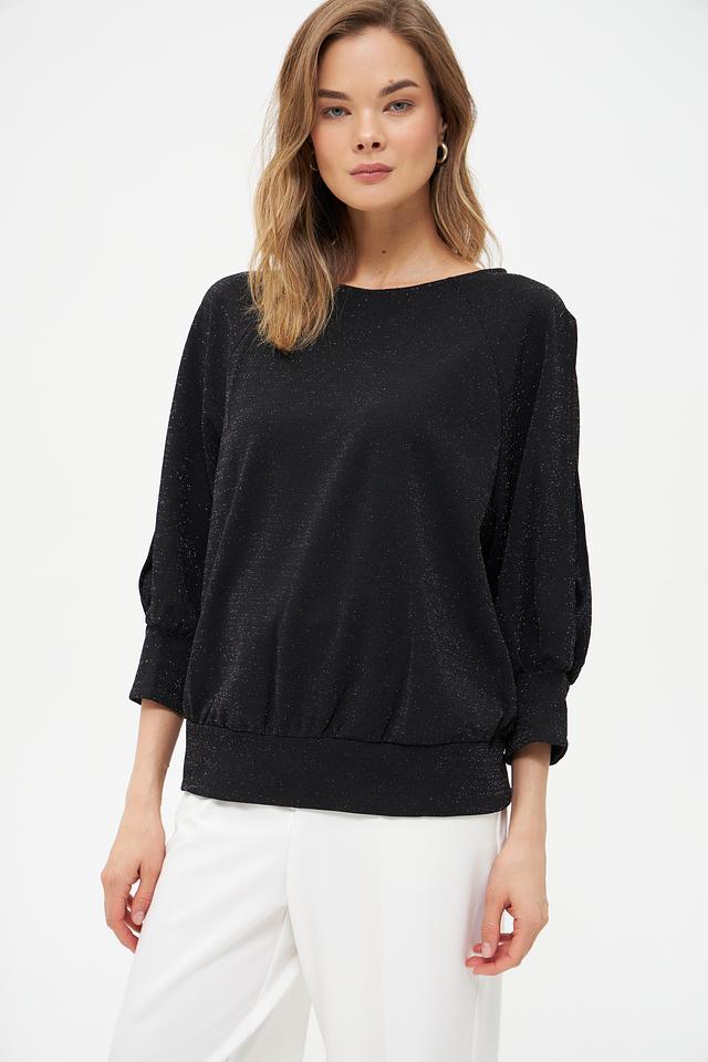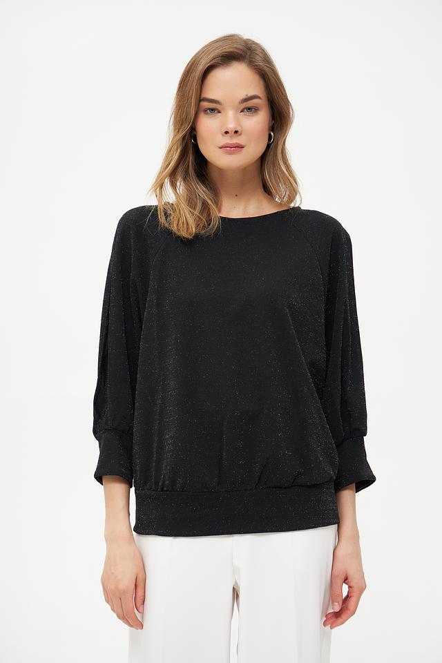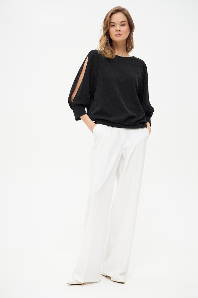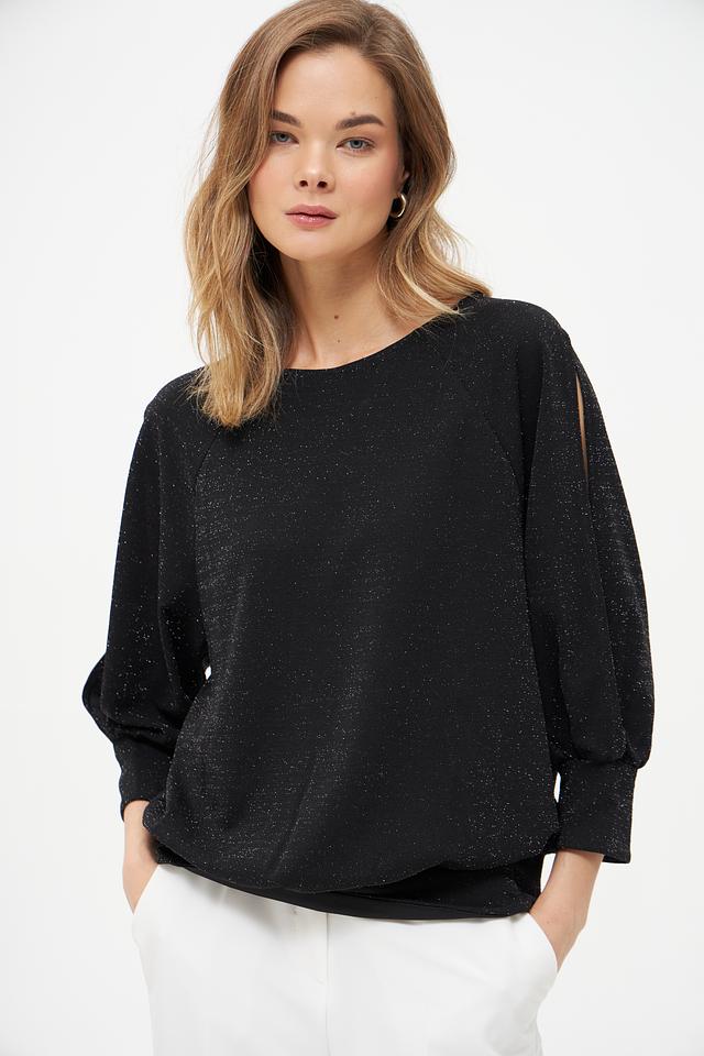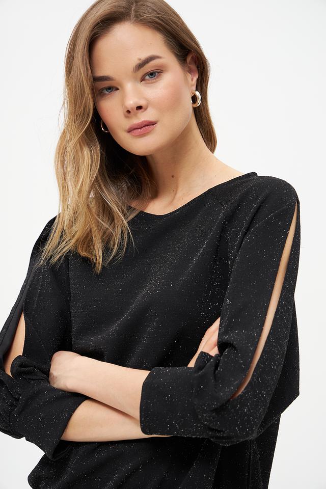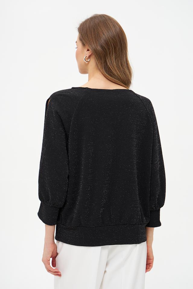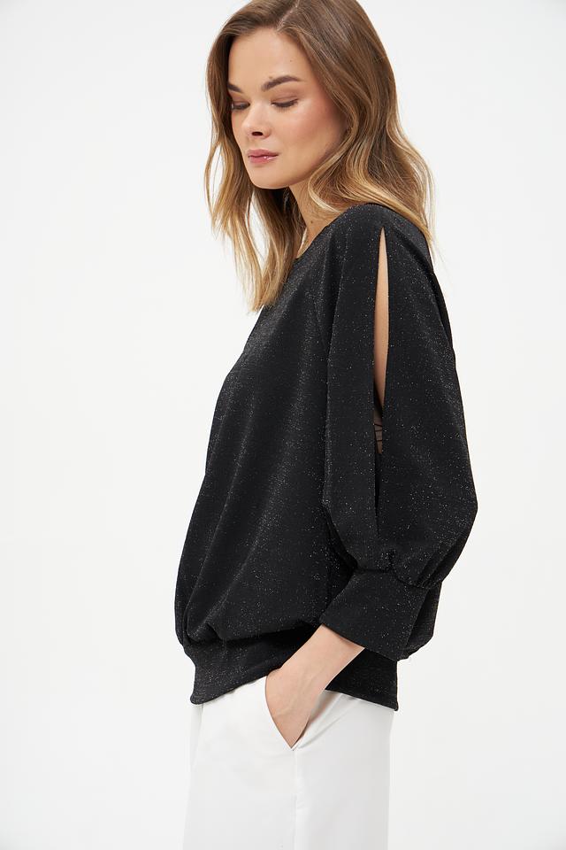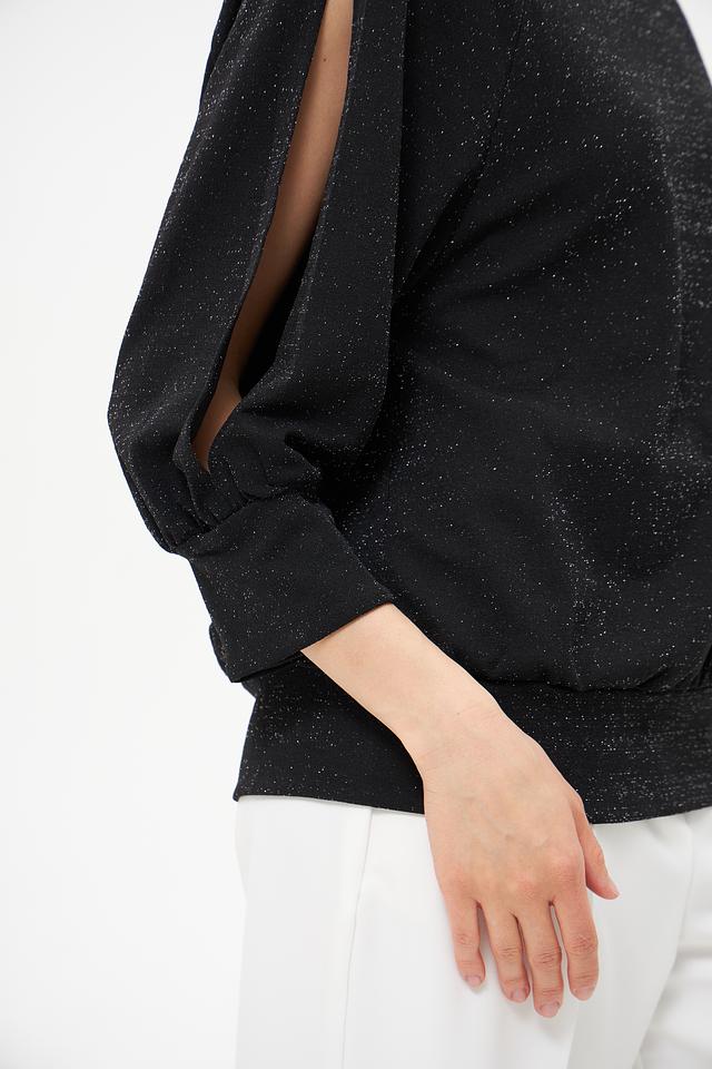 Модель отличается оригинальным дизайном рукавов-фонариков с вырезами на плечах, что добавляет ей лёгкости и изысканности. Ткань с деликатным мерцающим эффектом придает блузе особый блеск и привлекательность.