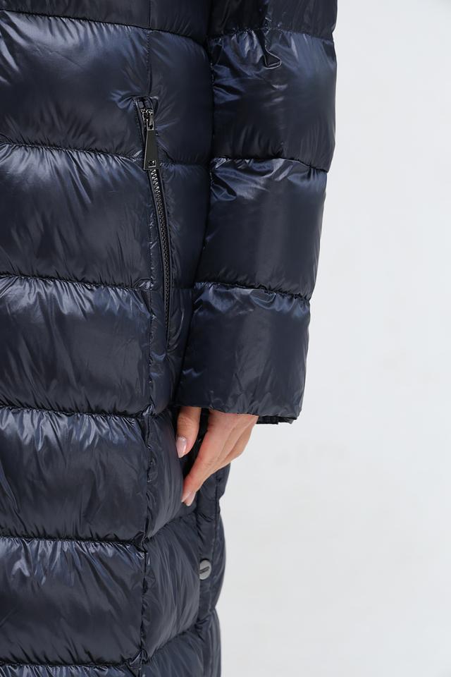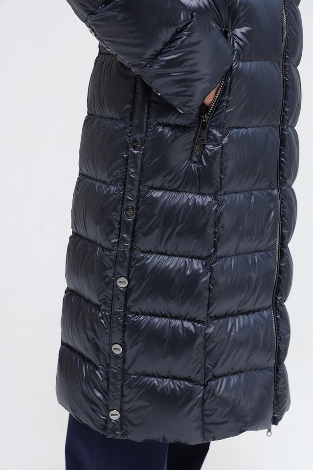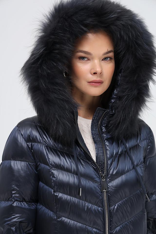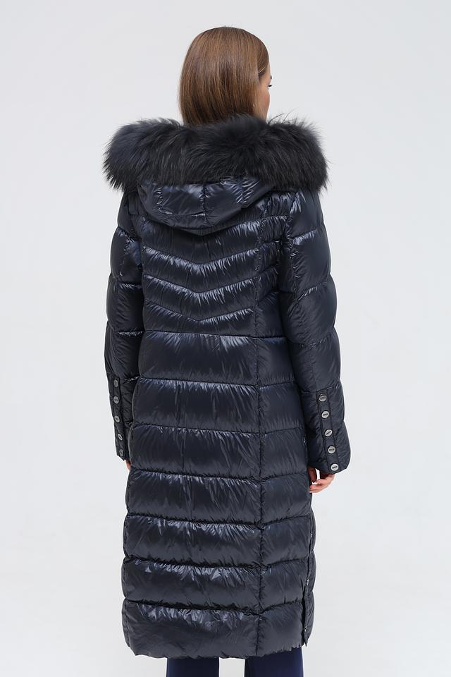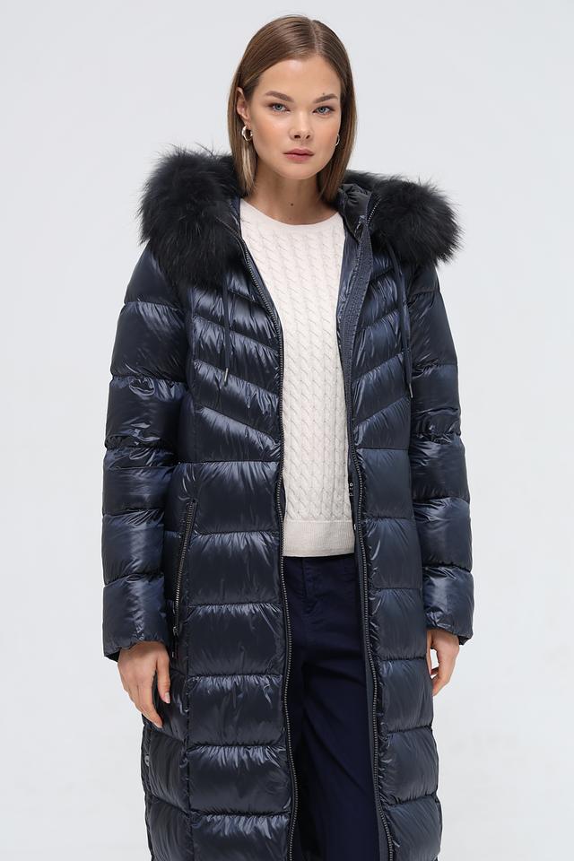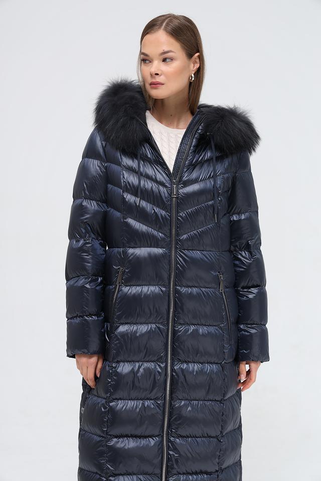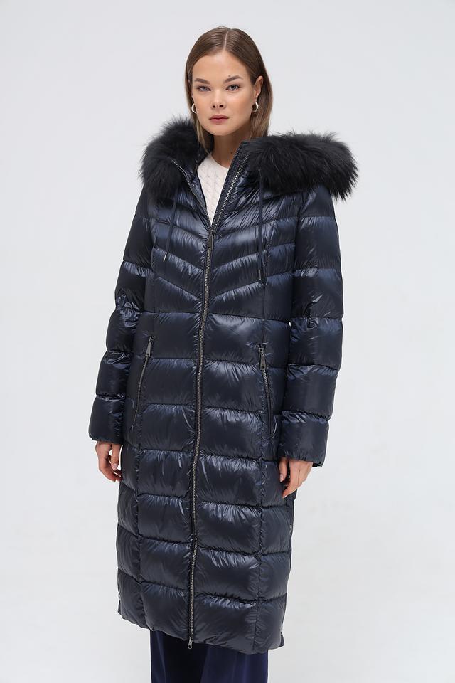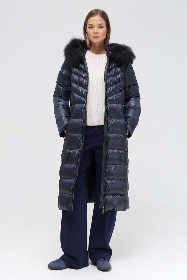 Модель имеет длину до середины икры, что обеспечивает дополнительное тепло и защиту от ветра. Пальто застегивается на молнию, что позволяет легко регулировать степень утепления. Капюшон украшен роскошным мехом, который не только согревает, но и придает образу элегантность.