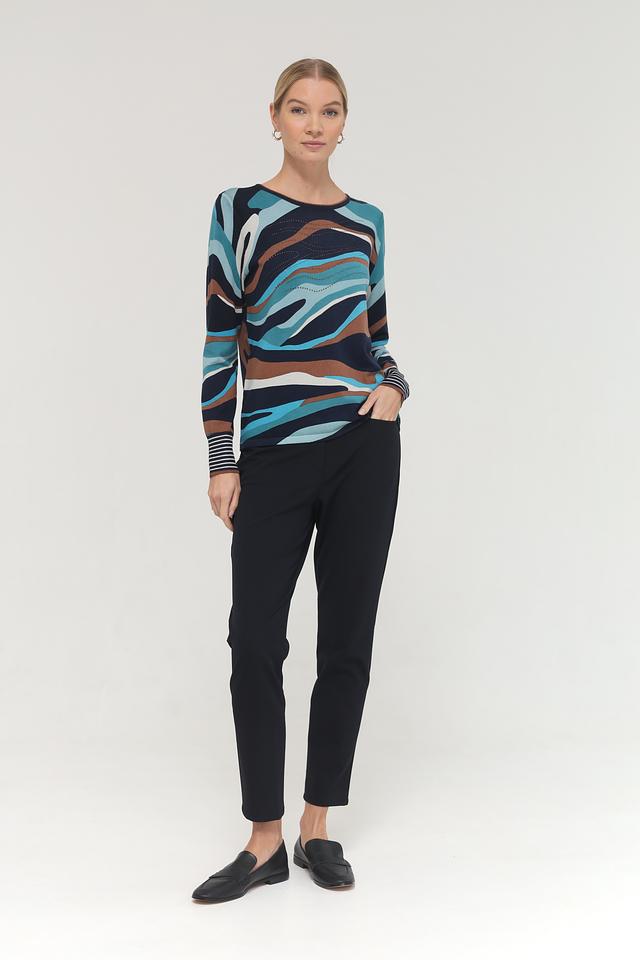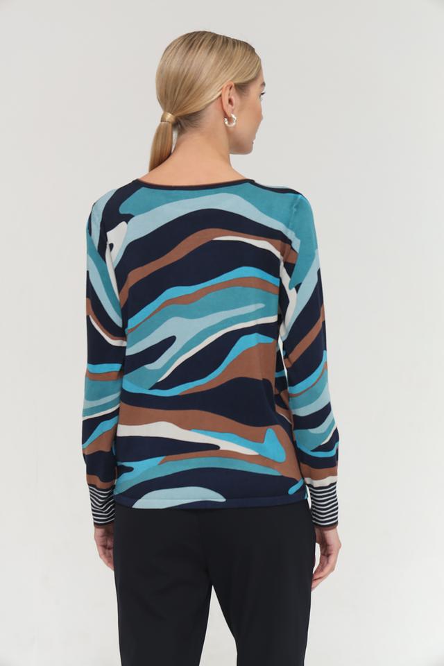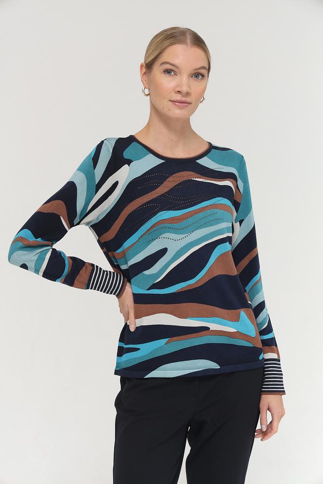 Пуловер имеет свободный крой и круглый вырез горловины. Его отличает яркий и необычный абстрактный принт, сочетающий в себе оттенки бирюзового, коричневого и тёмно-синего. Манжеты рукавов выполнены в полоску.