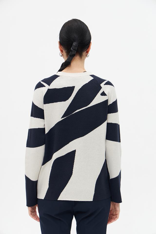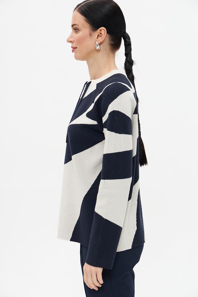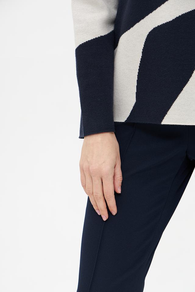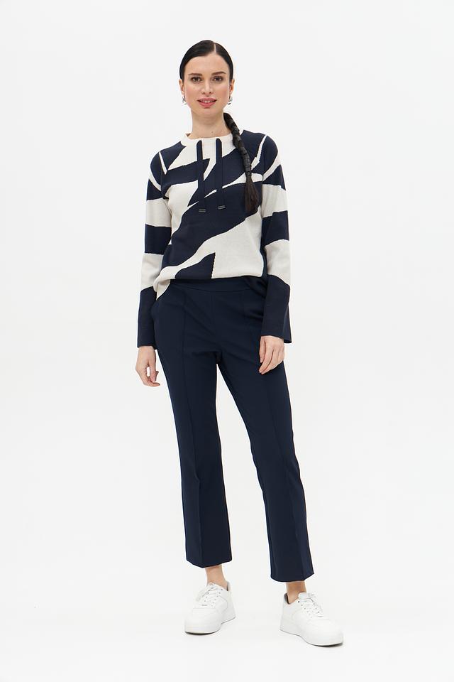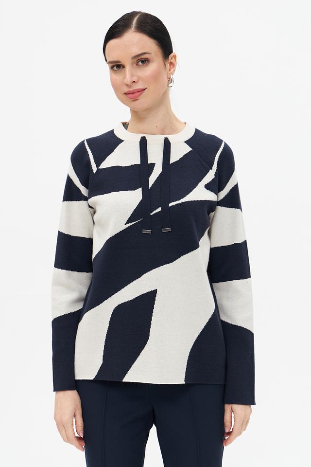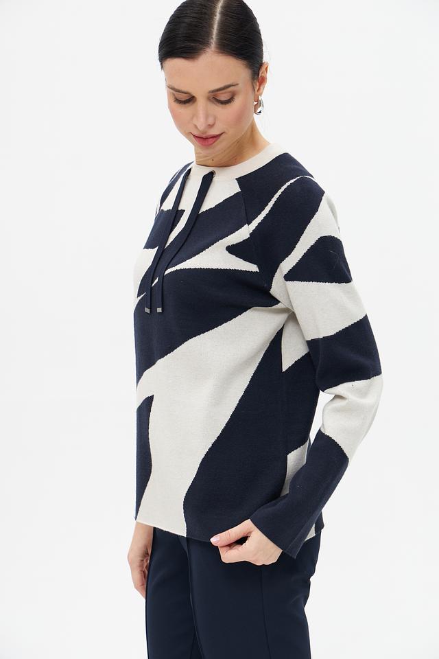 Этот пуловер от Betty Barclay – отличный выбор для создания стильного и комфортного образа. Пуловер выполнен в сочетании синего и кремового цветов с абстрактным геометрическим рисунком, который придает ему оригинальность.