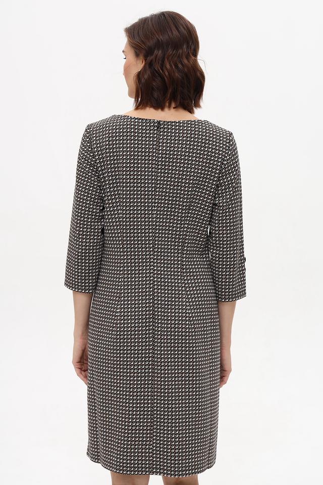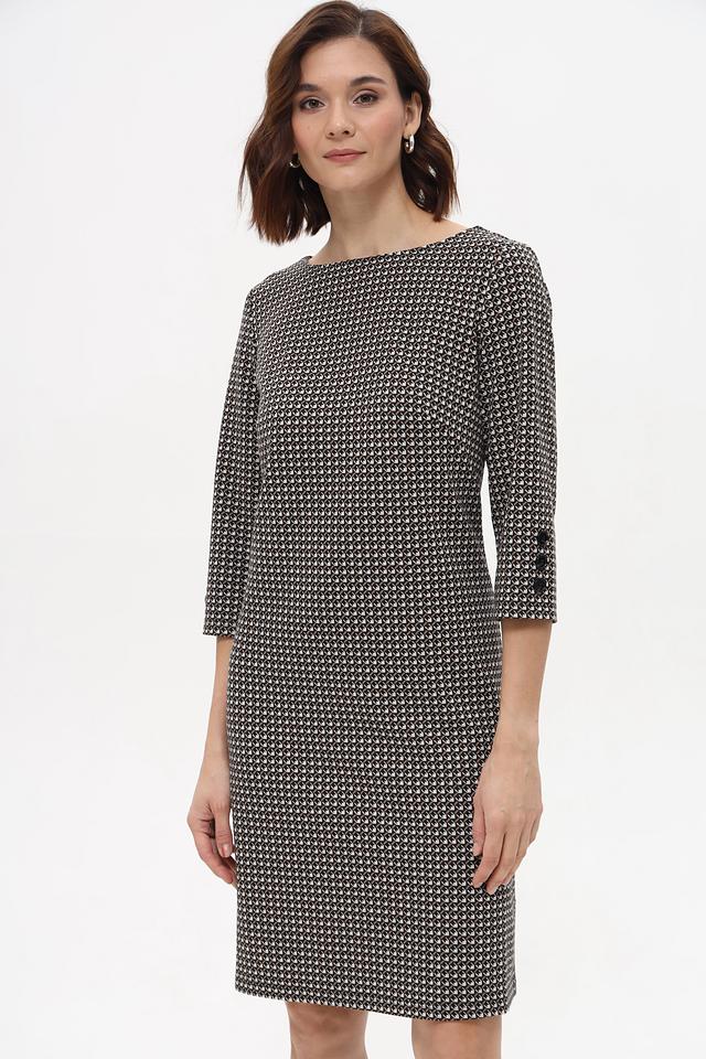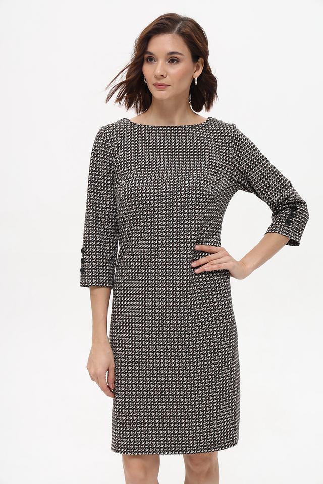 Модель имеет прямой силуэт и длину до колена, что делает его подходящим для различных случаев – от деловых встреч до повседневной носки. Круглый вырез горловины и короткие рукава с декоративными пуговицами добавляют образу изысканности.