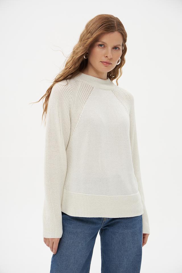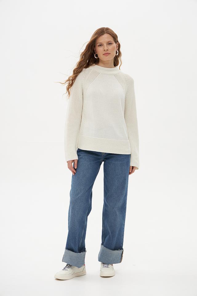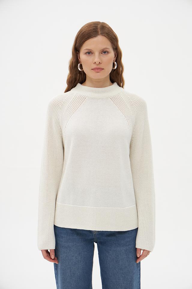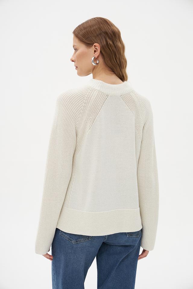 Особенностью данного пуловера является оригинальная текстура вязания. Рукава и нижняя часть изделия выполнены рельефным узором, который добавляет модели визуальный интерес. Пуловер идеально подойдет для создания повседневных образов, а также для более нарядных вариантов в сочетании с юбкой или брюками.