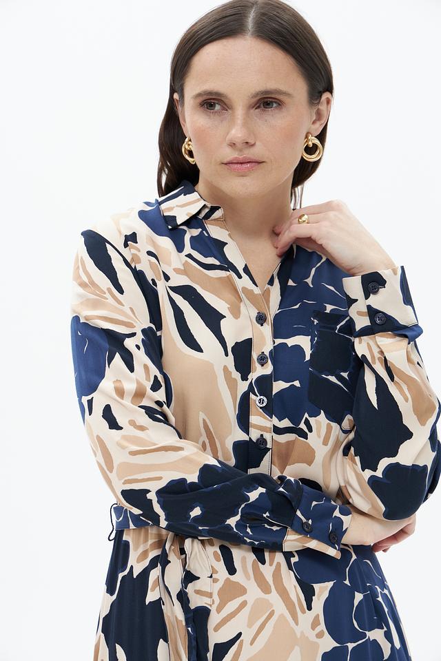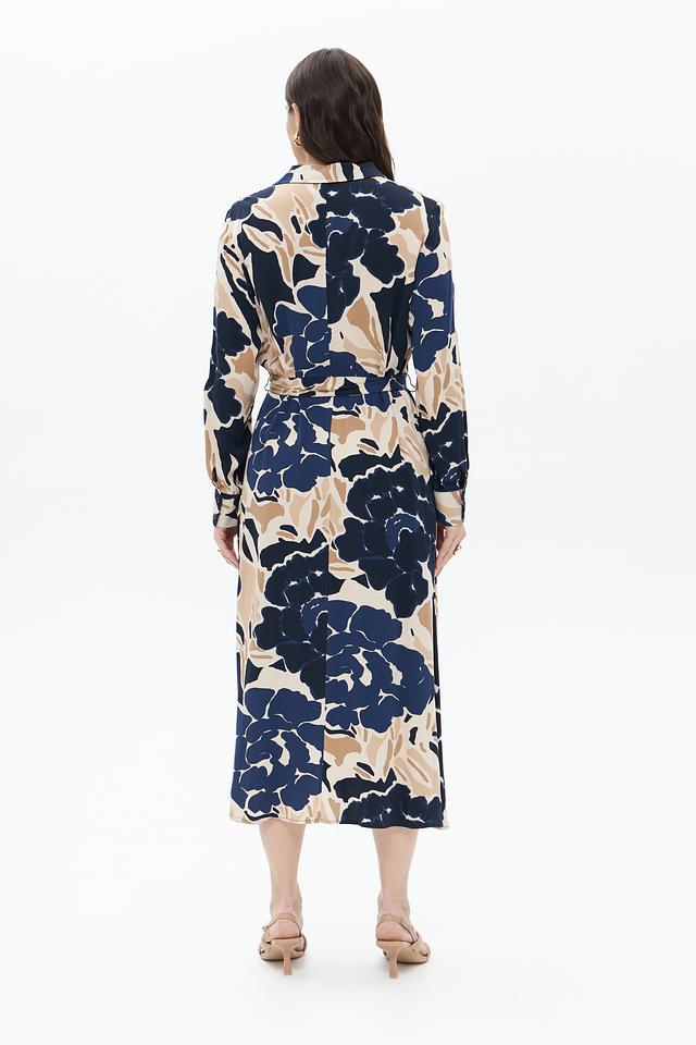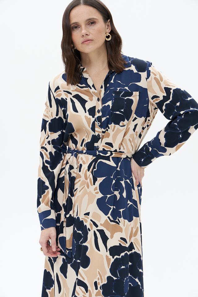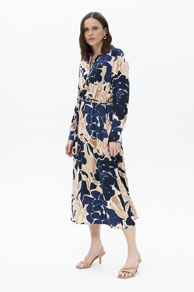 Платье отличается оригинальным цветочным принтом, сочетающим в себе бежевые и насыщенные синие оттенки. Застежка на пуговицах в верхней части платья и пояс позволяют регулировать посадку по фигуре.