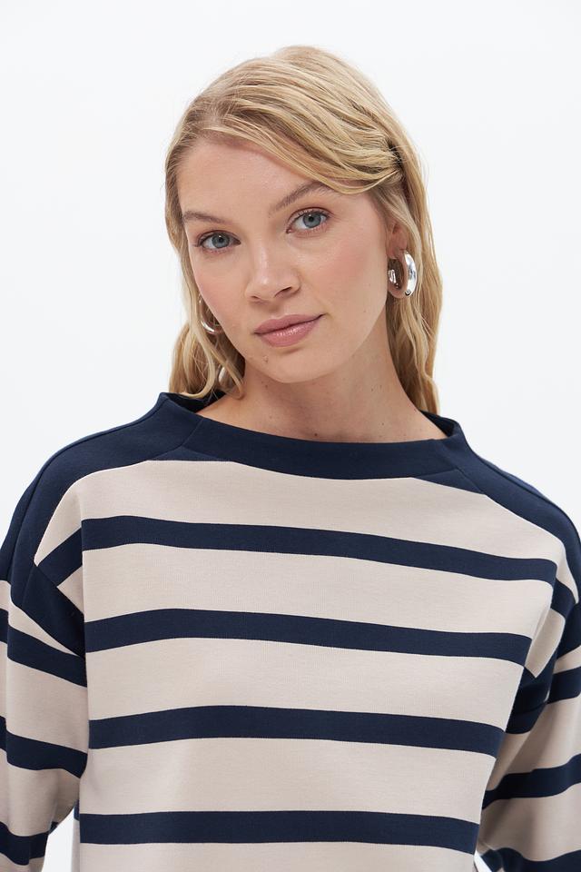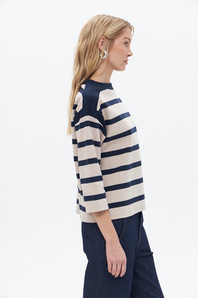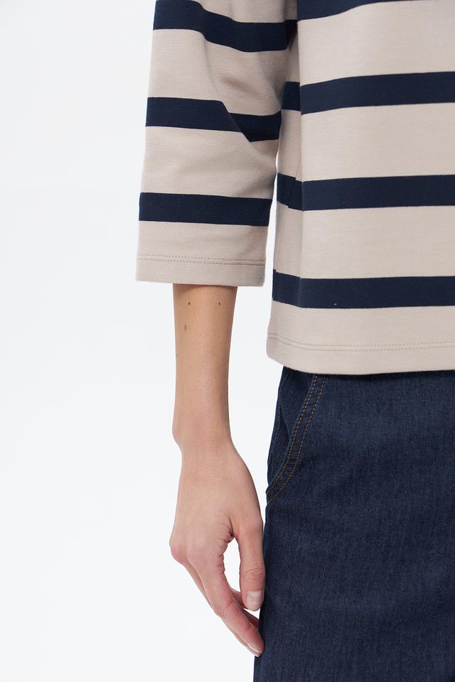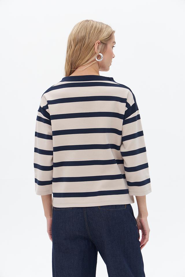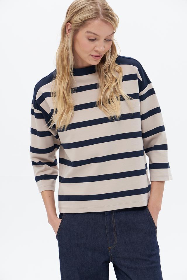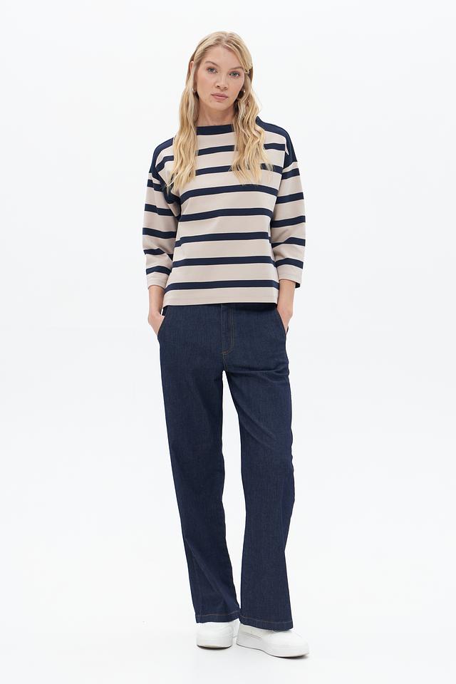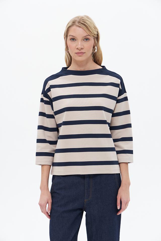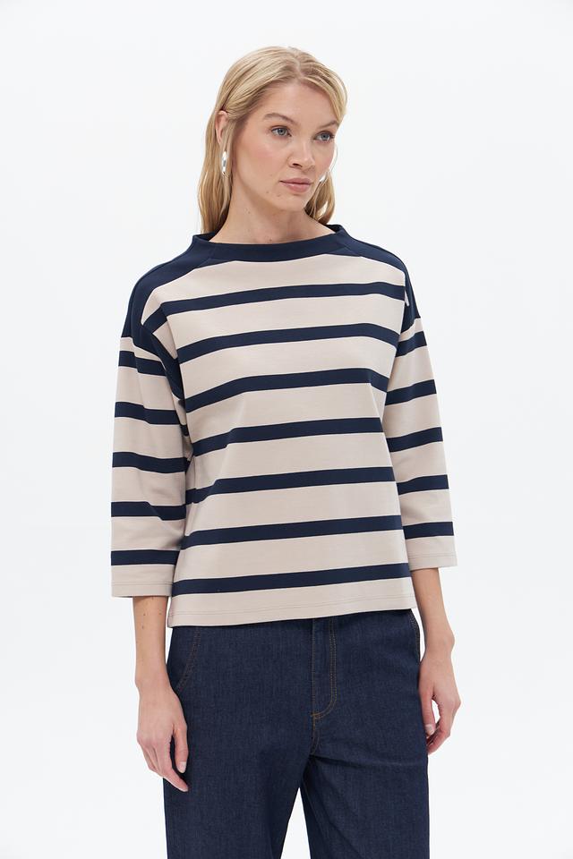 Женский пуловер Betty Barclay бежево-синего цвета с полоской. Изготовлен из хлопка с добавлением полиэстера и эластана для комфорта и сохранения формы. Состав: хлопок 85%, полиэстер 12%, эластан 3%