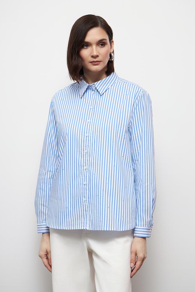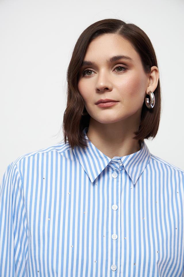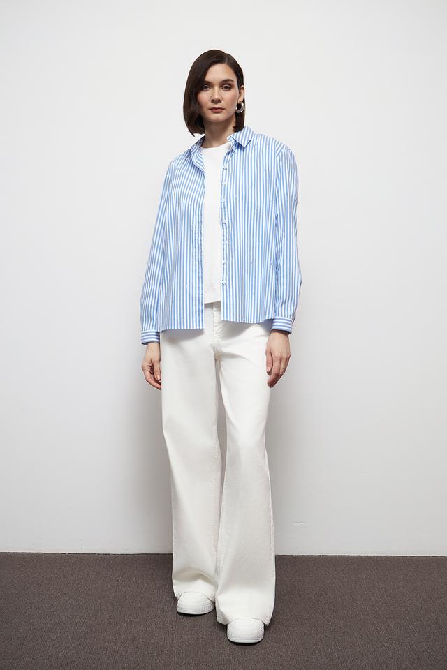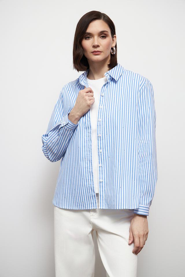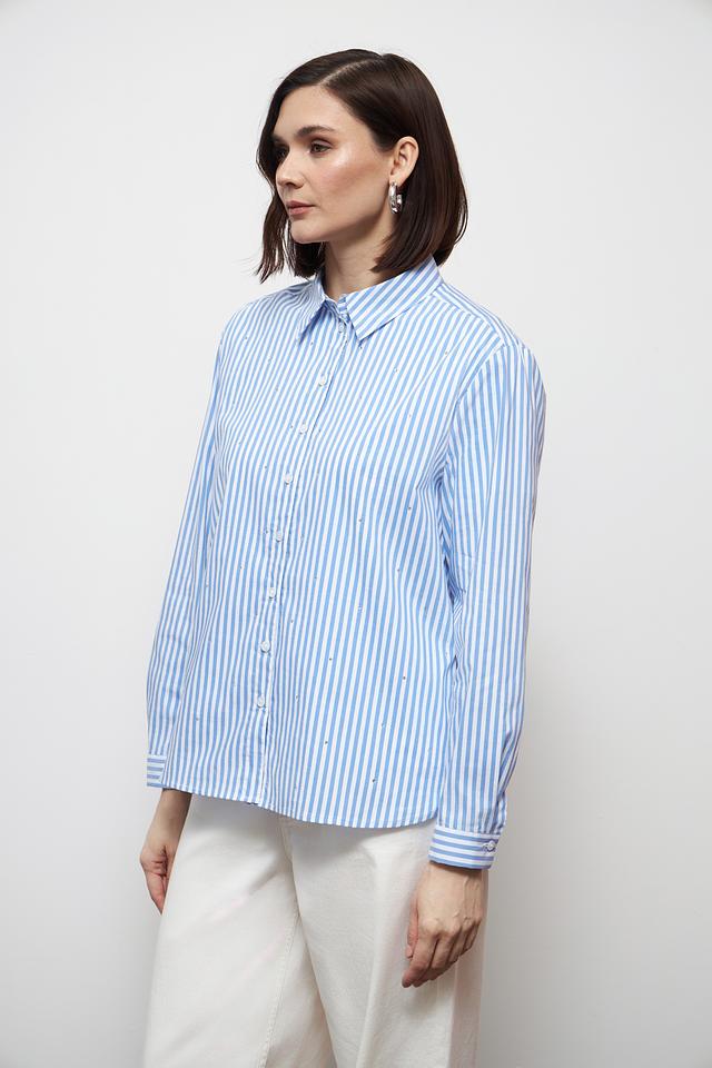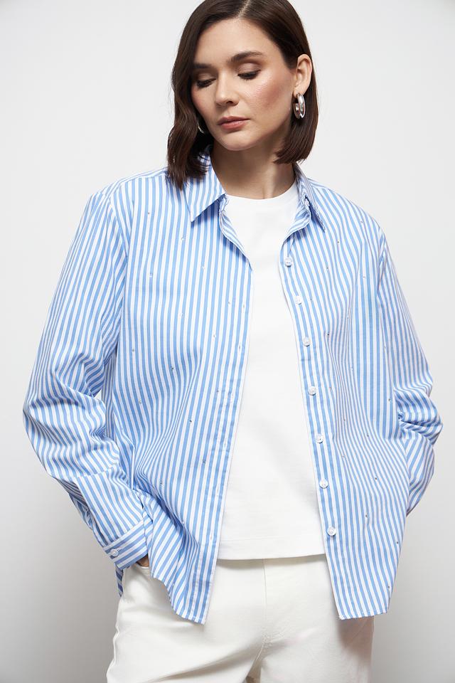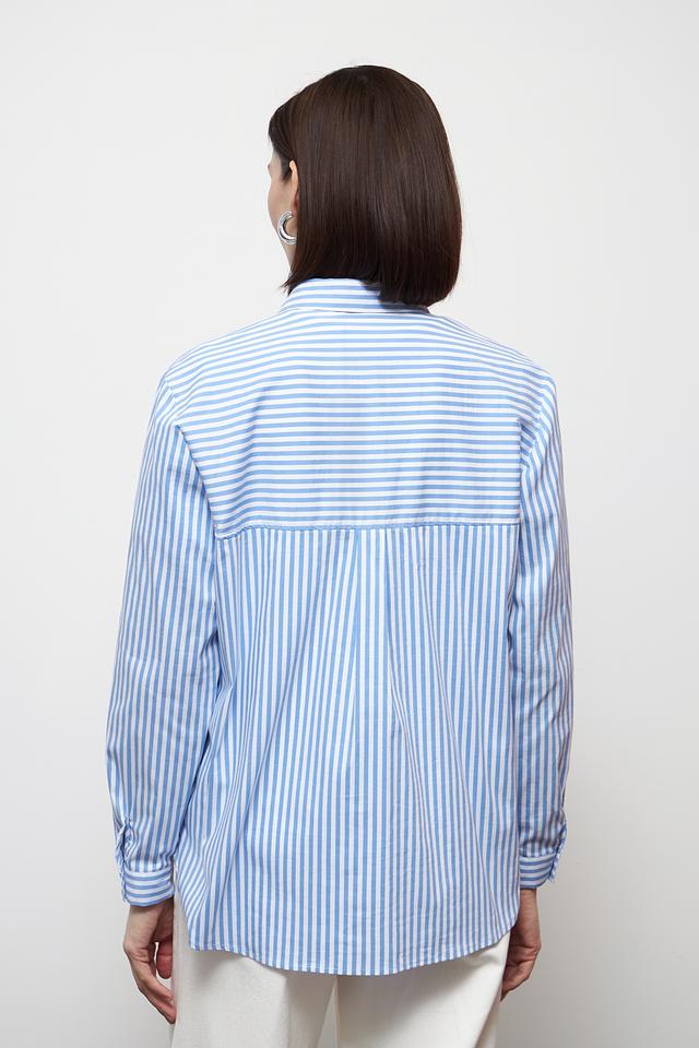 Рубашка имеет классический крой с длинными рукавами и воротником. Голубая полоска придает ей свежий и стильный вид. Застежка на пуговицах по всей длине. Рукава рубашки имеют манжеты на пуговицах.