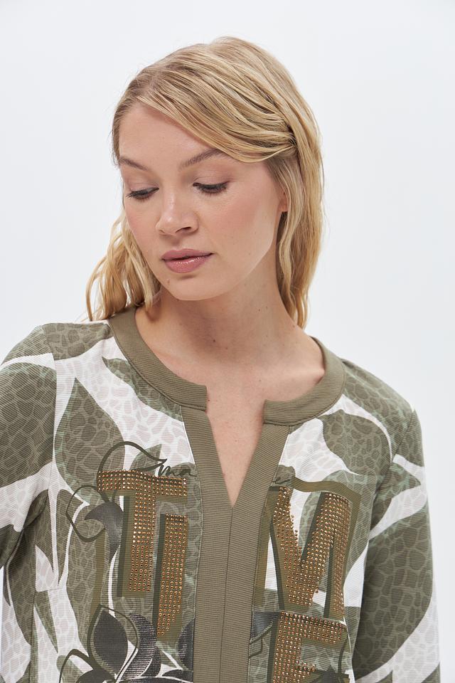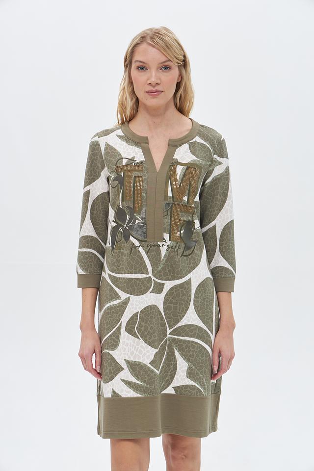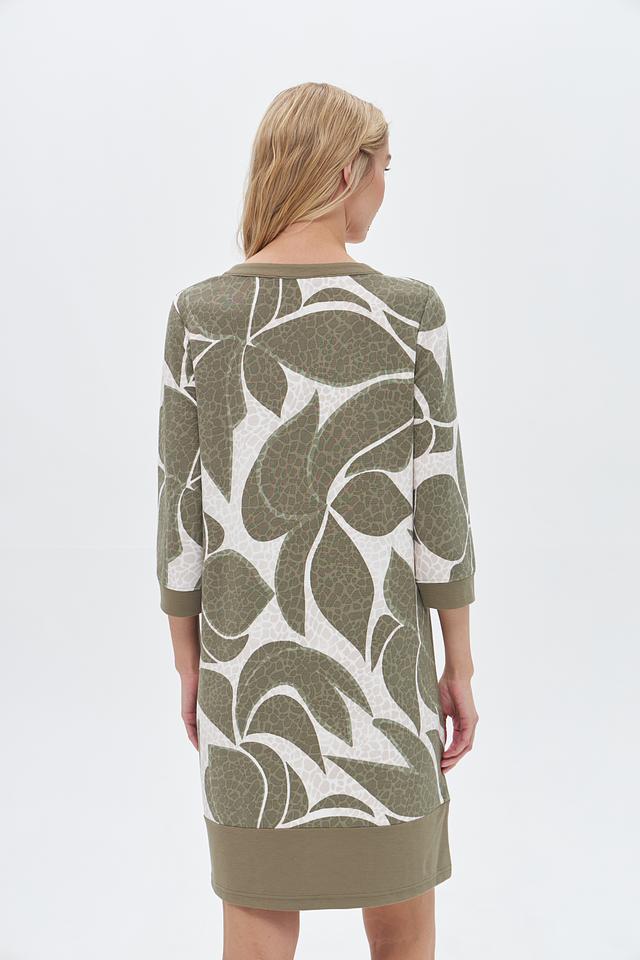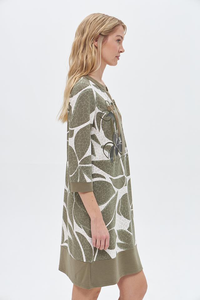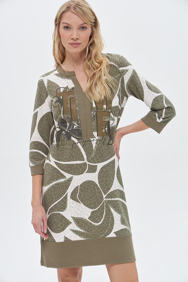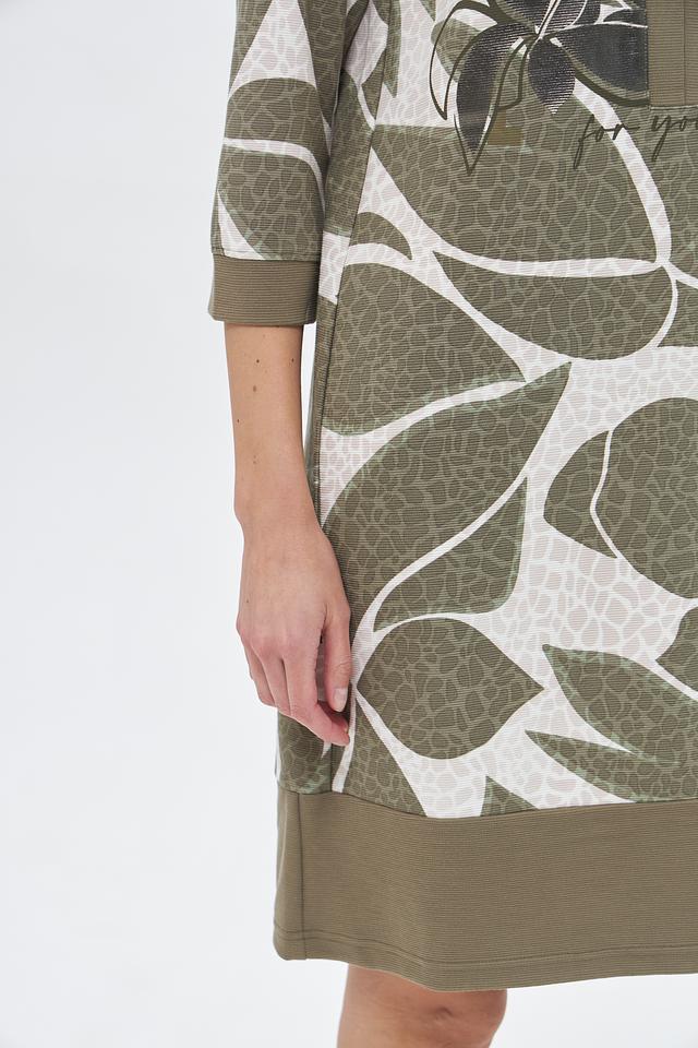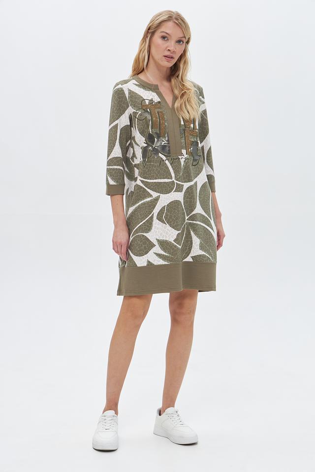 Платье Betty Barclay цвета хаки с оригинальным цветочным принтом и V-образным вырезом. Модель выполнена из мягкой вискозы с добавлением полиэстера и эластана, обеспечивающих комфорт и хорошую посадку. Состав: вискоза 66%, полиэстер 27%, эластан 7%