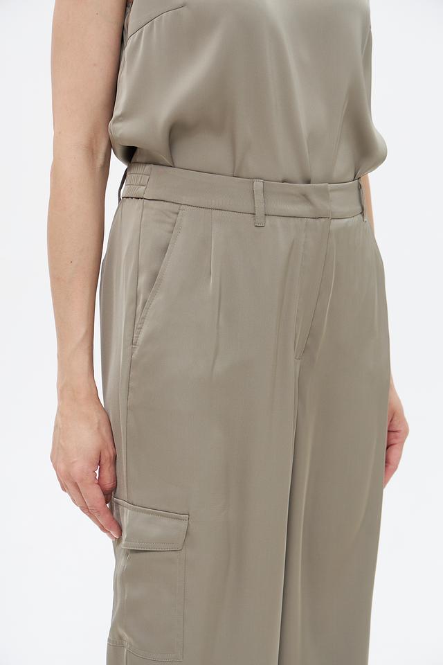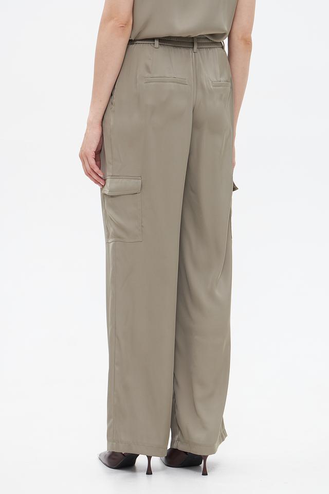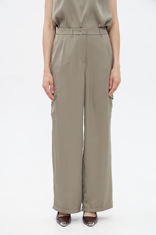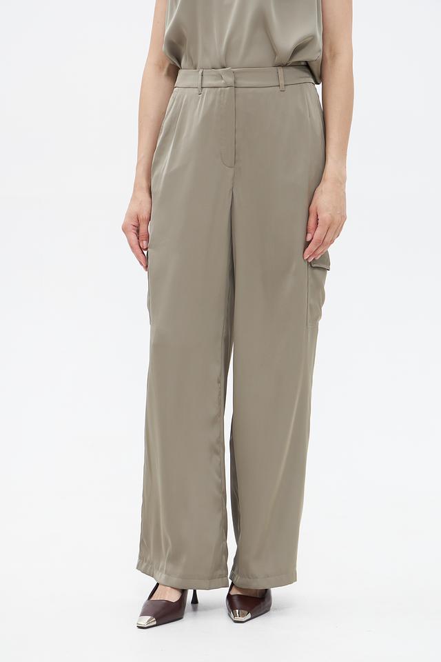 Брюки имеют прямой крой и широкие штанины, что обеспечивает свободу движений и создает современный силуэт. Высокая посадка подчеркивает талию и визуально удлиняет ноги. На брюках предусмотрены функциональные карманы в стиле карго, добавляющие образу практичности и динамики.