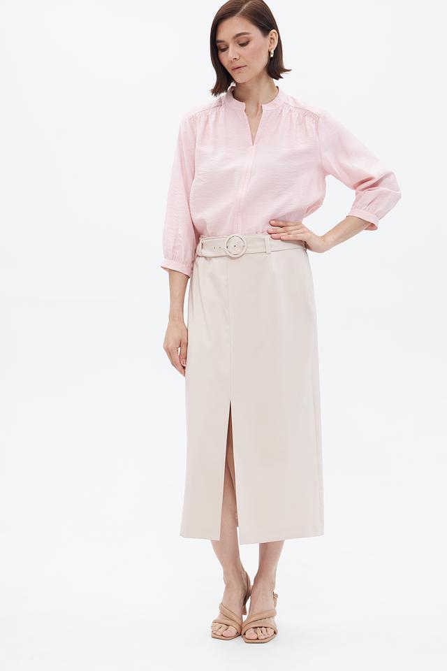 Юбка имеет классическую длину миди и прямой крой, который подчеркивает достоинства фигуры. Оригинальный элемент дизайна – разрез спереди, который добавляет юбке динамичности и современности.