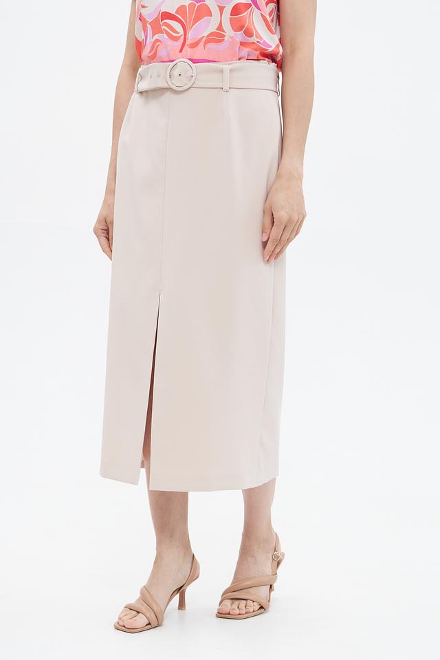 Материал юбки – полиэстер (86%) с добавлением эластана (14%). Это сочетание обеспечивает комфорт в носке, хорошую посадку и устойчивость к сминанию. Юбка дополнена широким поясом с крупной пряжкой, который акцентирует талию и завершает образ.