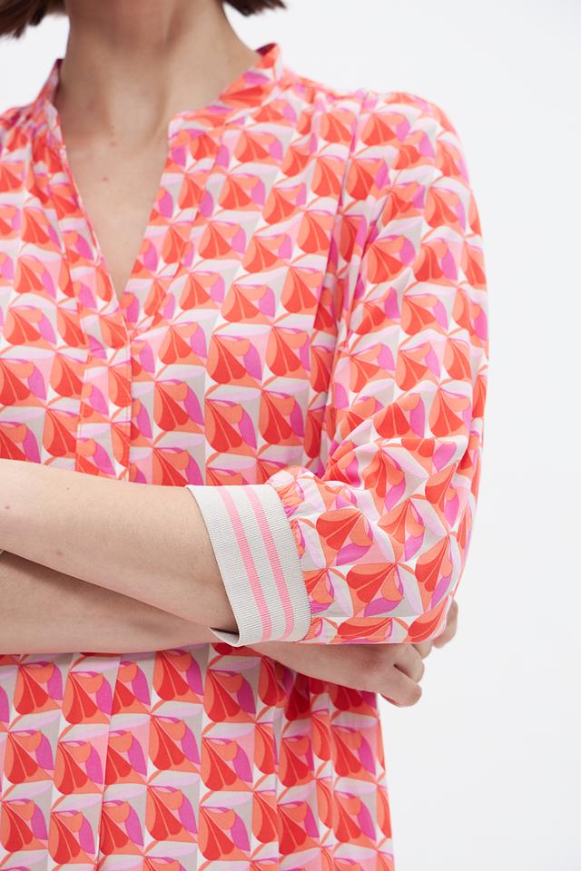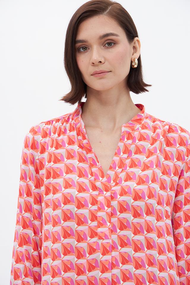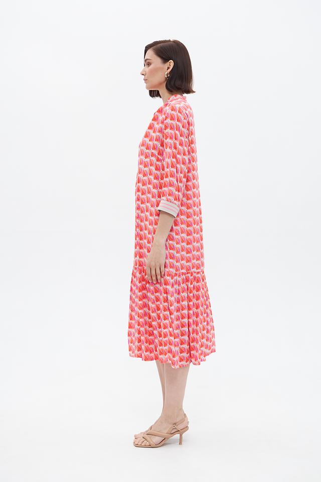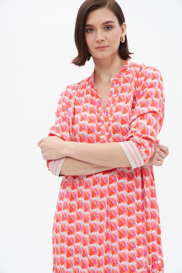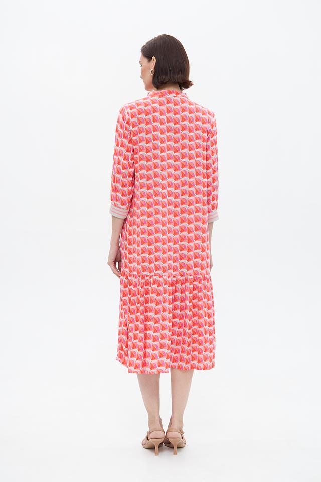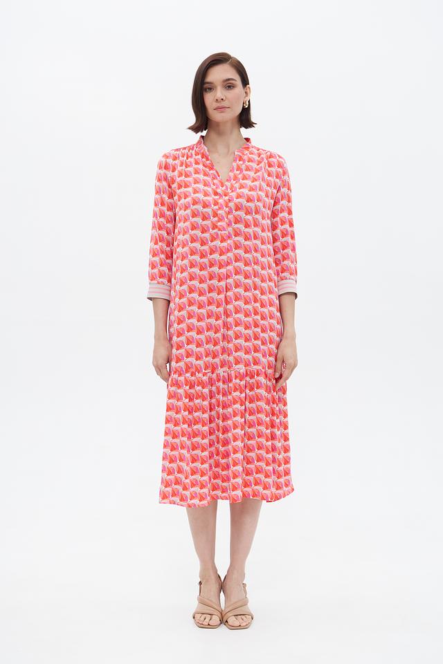 Модель имеет прямой силуэт, V-образный вырез и короткие рукава 3/4. Платье украшено ярким геометрическим принтом в оранжево-розовой гамме, который придает образу свежесть и оригинальность. Юбка платья выполнена в виде волана, что добавляет ему легкости и воздушности.