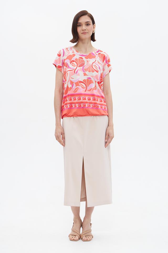 Блузка имеет свободный крой, который обеспечивает комфорт в носке и позволяет создать расслабленный, но элегантный силуэт. Короткие рукава и круглый вырез делают модель универсальной и подходящей для различных случаев – от повседневной носки до особых мероприятий.