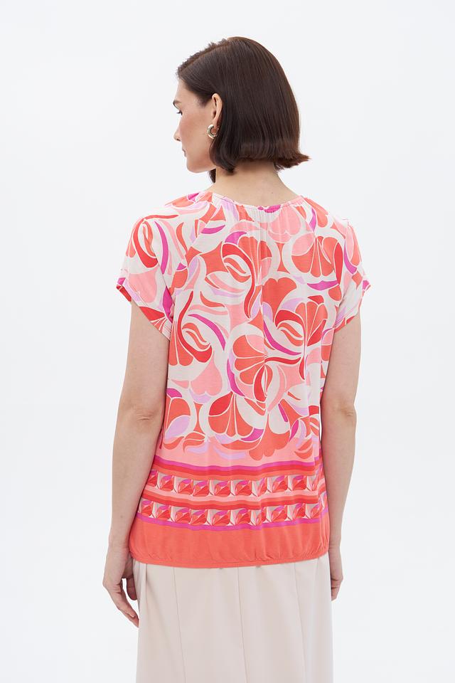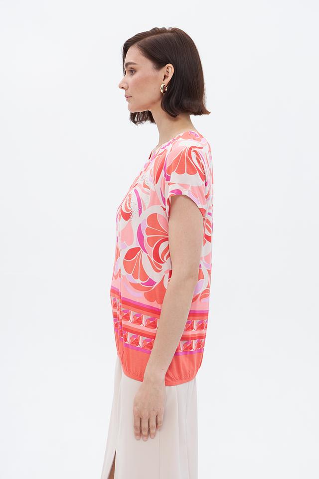 Эта стильная блузка от Betty Barclay станет ярким акцентом вашего образа. Модель выполнена в нежном розовом цвете и украшена эффектным цветочным принтом, сочетающим в себе оттенки розового, коричневого и белого.