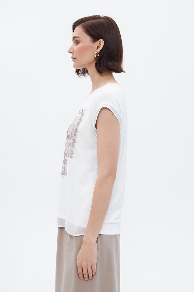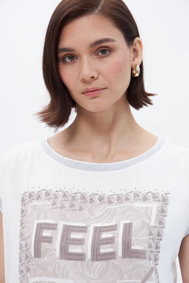 Белая блузка Betty Barclay с оригинальным принтом "FEEL good" станет стильным дополнением к вашему гардеробу. Модель свободного кроя с короткими рукавами выполнена из лёгкой вискозы с добавлением эластана. Состав: вискоза 95%, эластан 5%