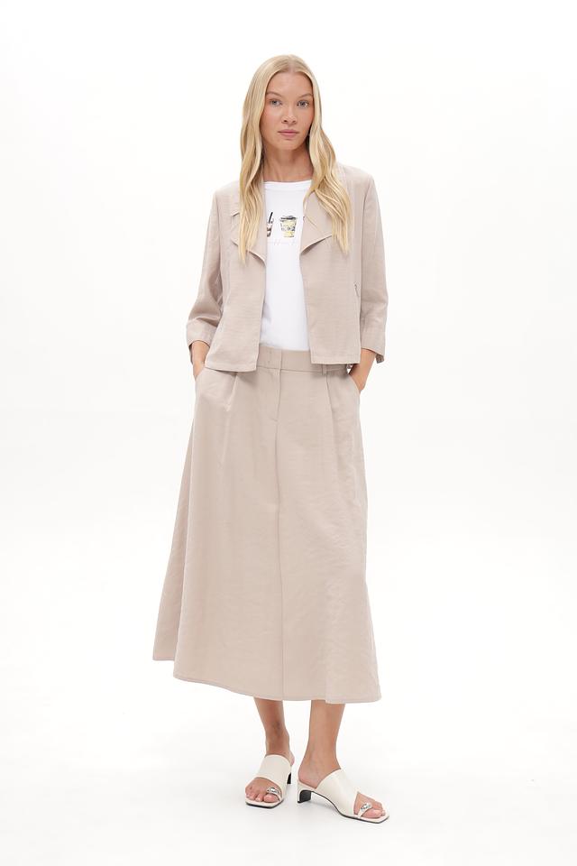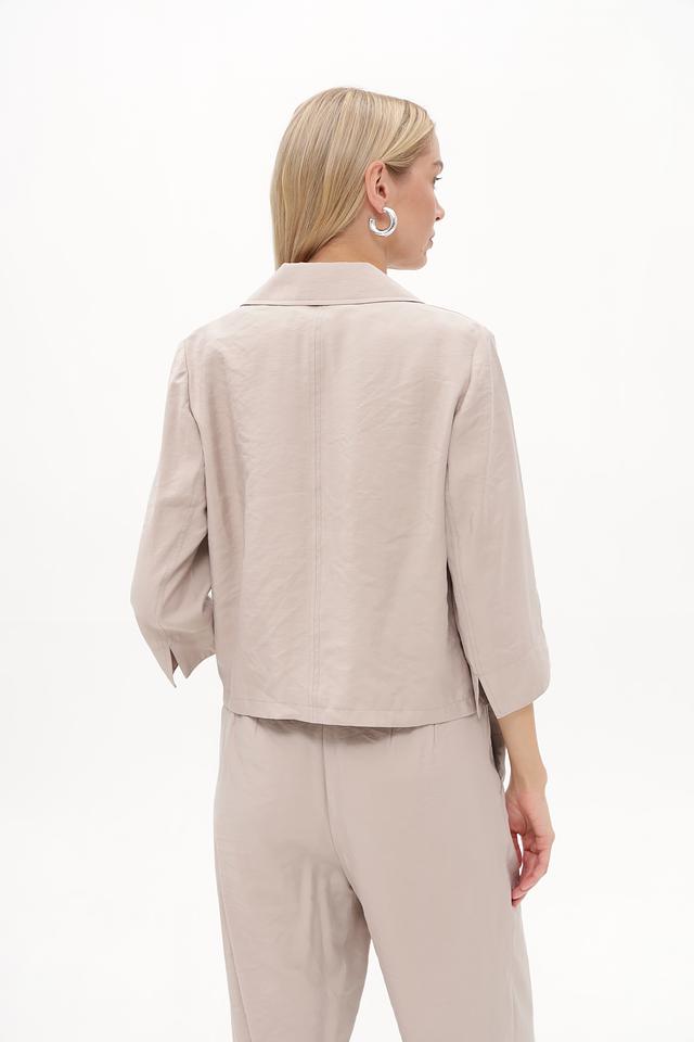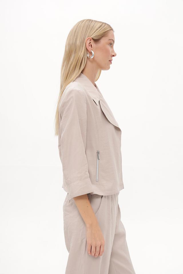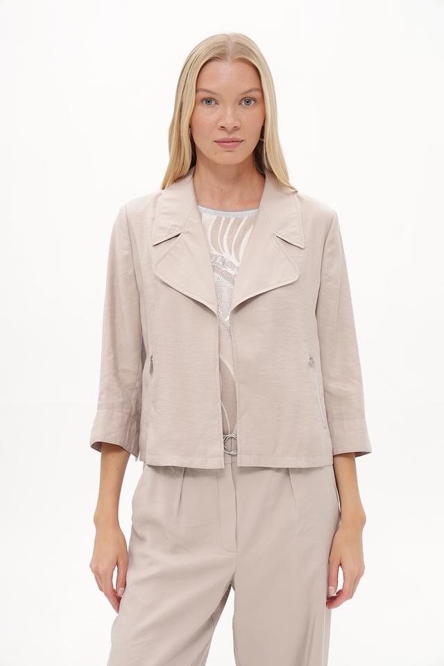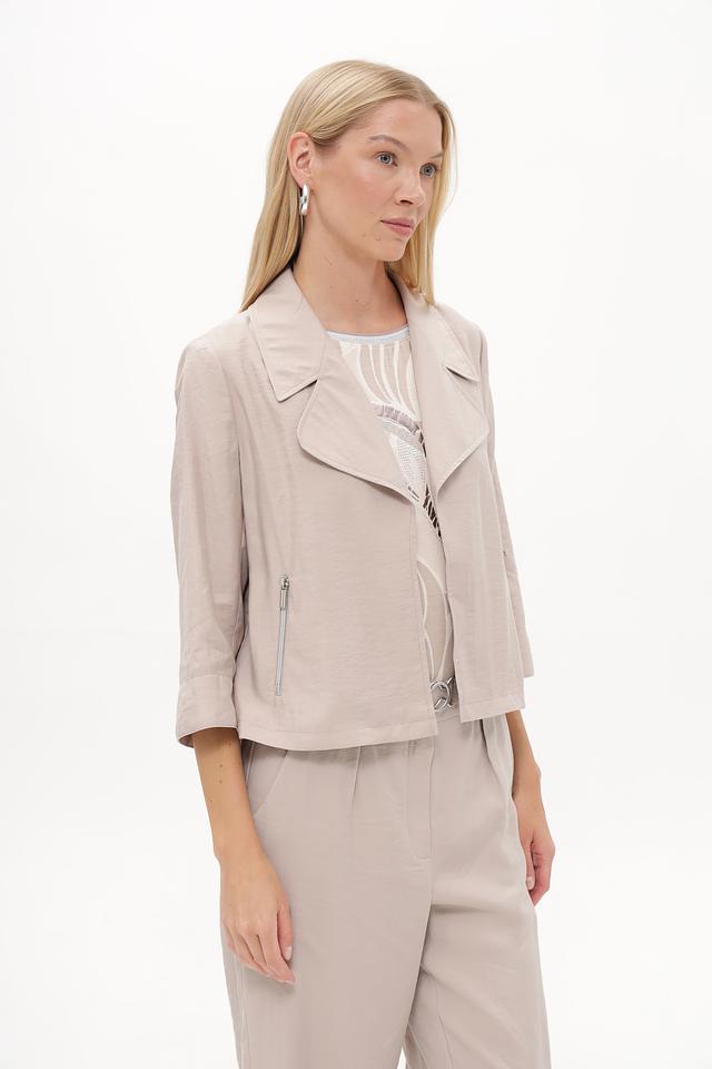 Жакет имеет прямой крой, воротник и застежку на молнию. Рукава ¾ делают его идеальным для теплой погоды или для создания многослойных образов. Материал жакета – это сочетание модала (89%) и переработанного полиэстера (11%), что обеспечивает приятные тактильные ощущения и заботу об окружающей среде.