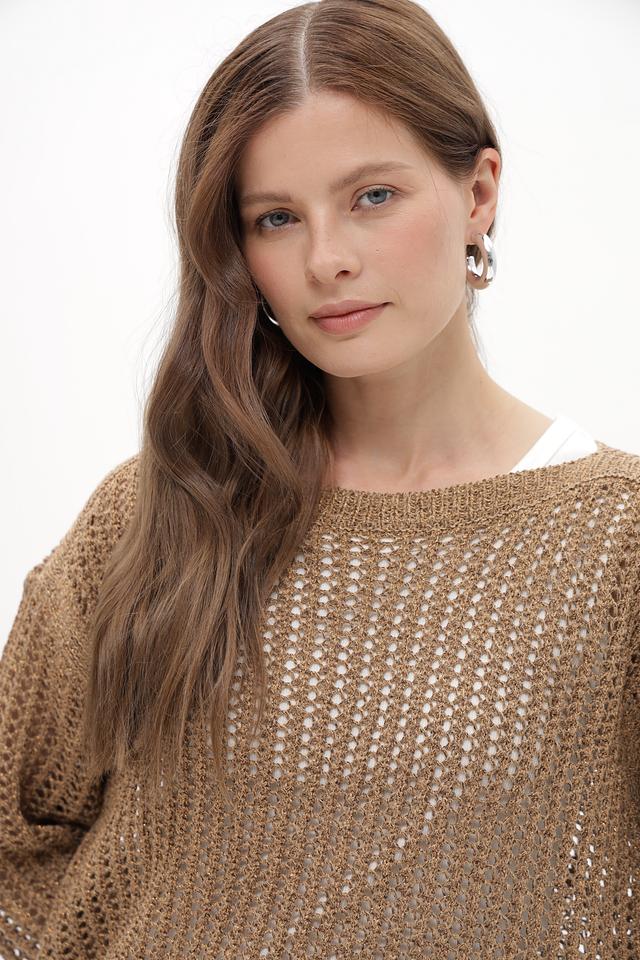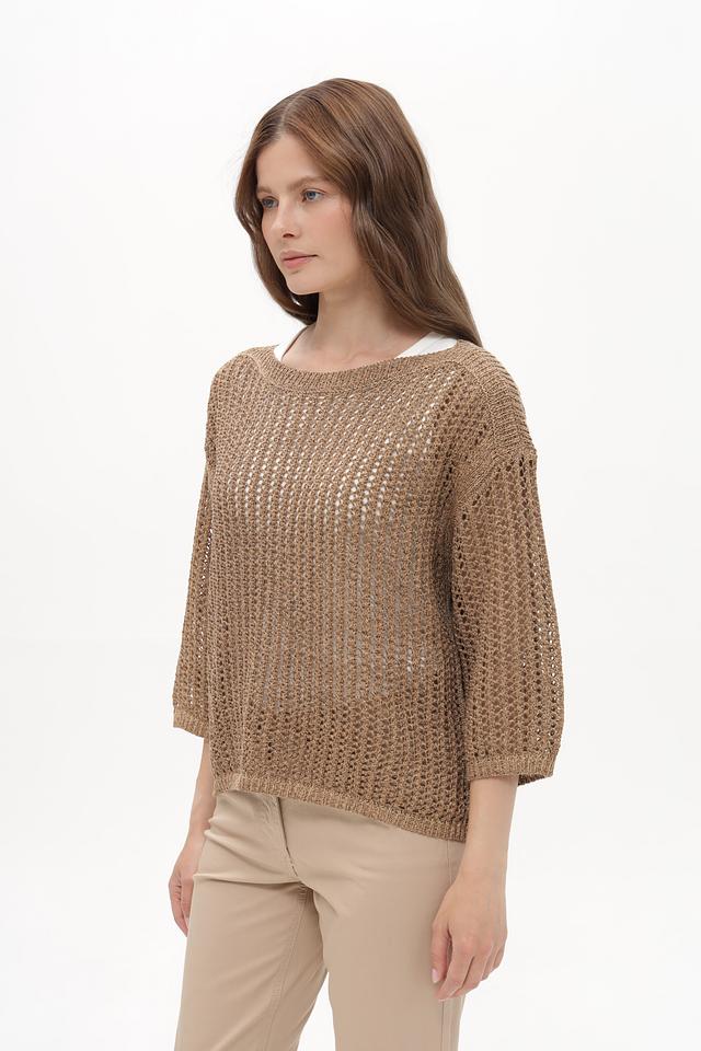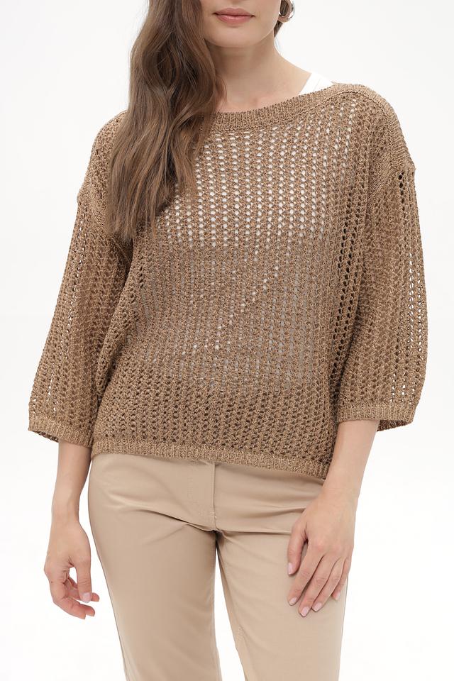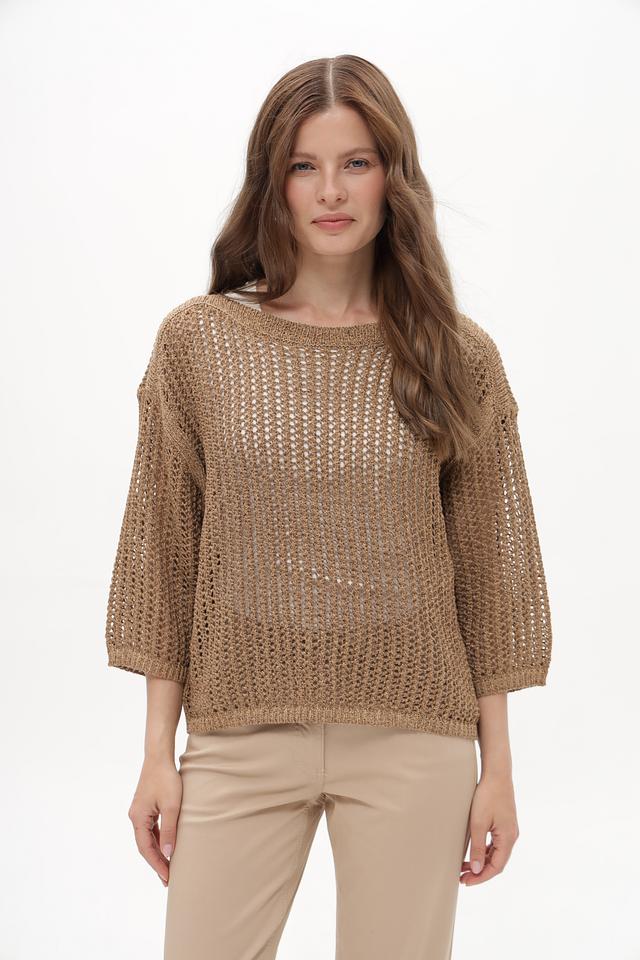 Пуловер имеет свободный крой и короткие рукава, что делает его идеальным для создания повседневных образов. Ажурное полотно позволяет коже дышать, обеспечивая комфорт даже в теплую погоду.