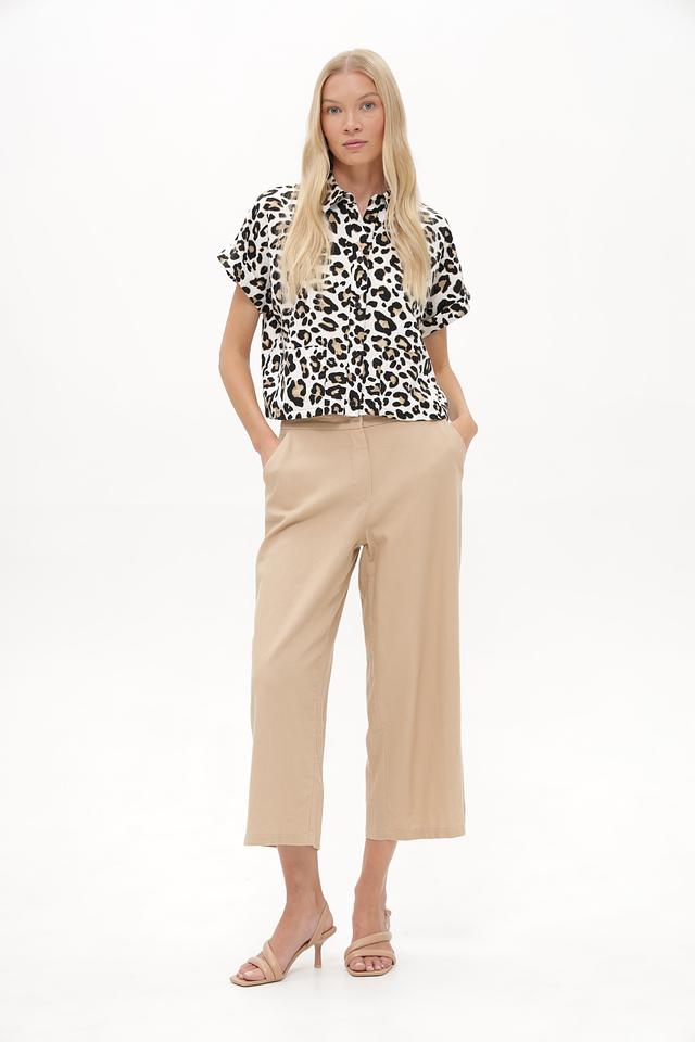 Модель имеет классический крой с короткими рукавами и отложным воротником. Блуза застегивается на пуговицы по всей длине, что позволяет регулировать степень прилегания. Изготовлена из сочетания льна и вискозы, что обеспечивает комфорт и воздухопроницаемость.