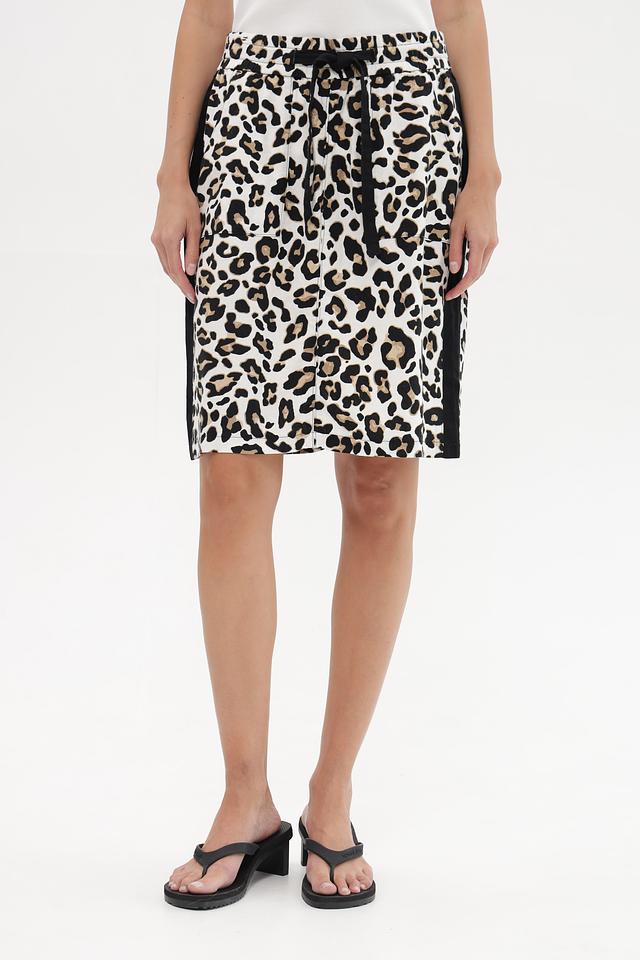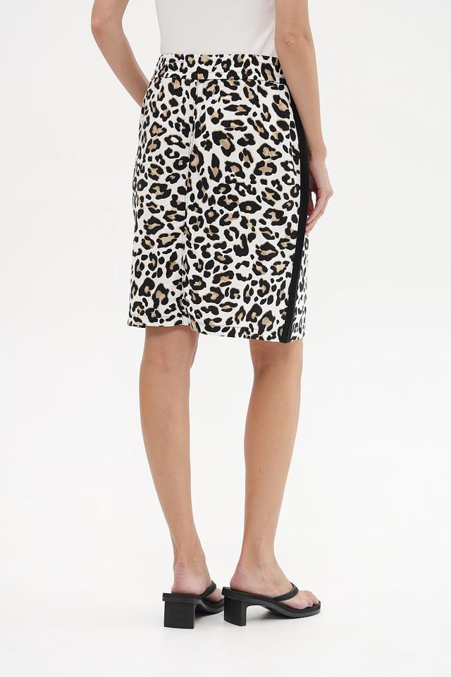 Юбка имеет прямой крой и длину до колена, что делает её универсальной для различных типов фигур. Декоративные завязки на талии позволяют регулировать посадку и подчеркивать силуэт. Принт в виде леопарда добавляет образу дерзости и оригинальности.