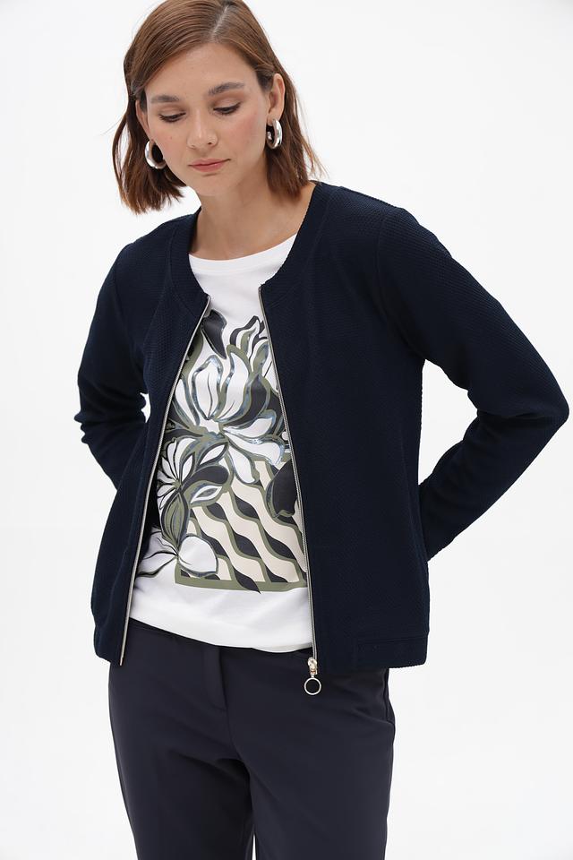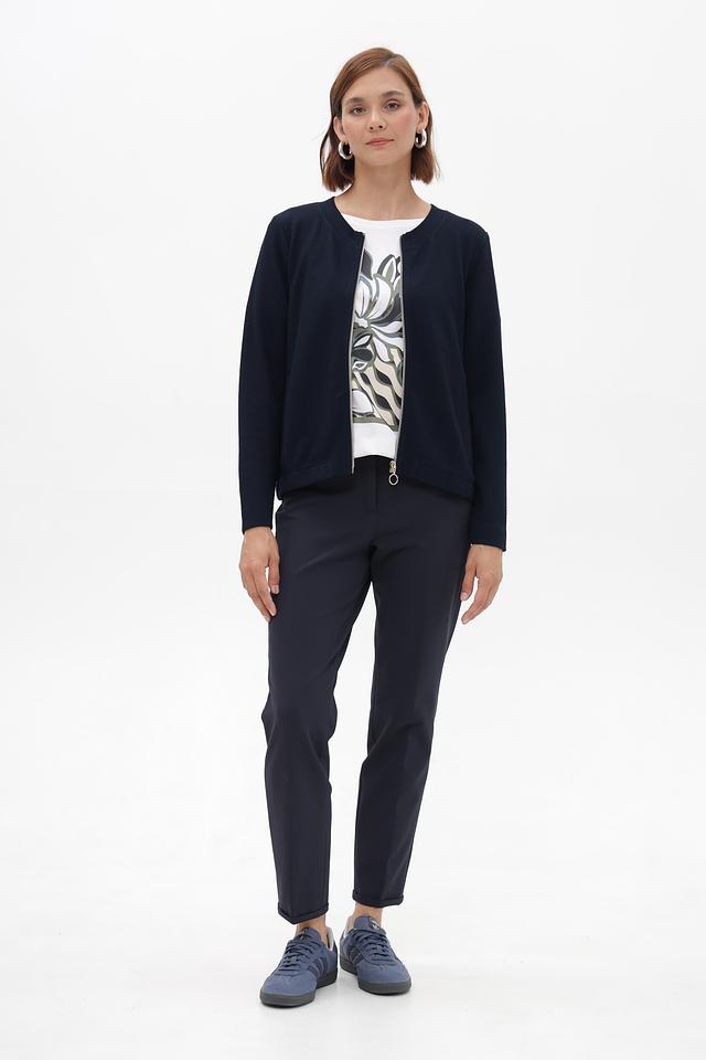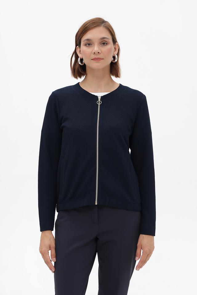 Женский жакет Betty Barclay темно-синего цвета с застежкой на молнию. Изготовлен из мягкого трикотажа с добавлением вискозы и эластана для комфорта и хорошей посадки. Состав: полиэстер 75%, вискоза 22%, эластан 3%