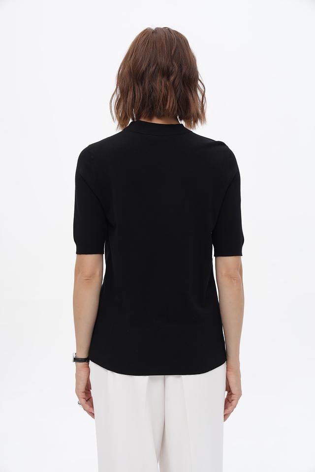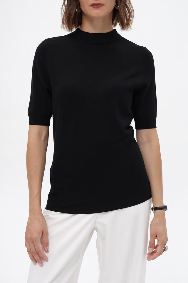 Пуловер имеет прямой крой и короткий рукав, что делает его идеальным для тёплой погоды или для создания многослойных луков. Высокий воротник добавляет изысканности и позволяет носить изделие как самостоятельный элемент, так и под жакет или пальто.