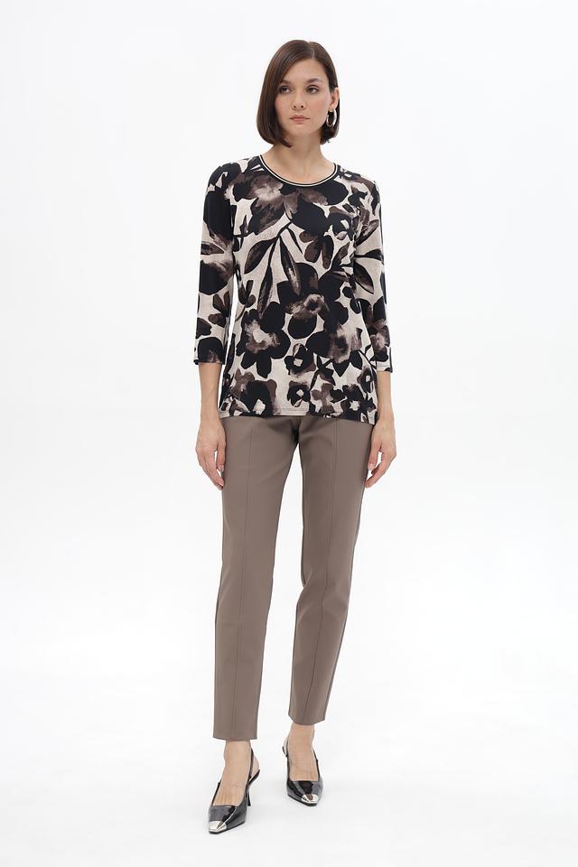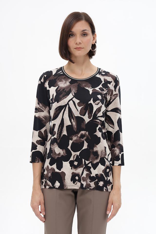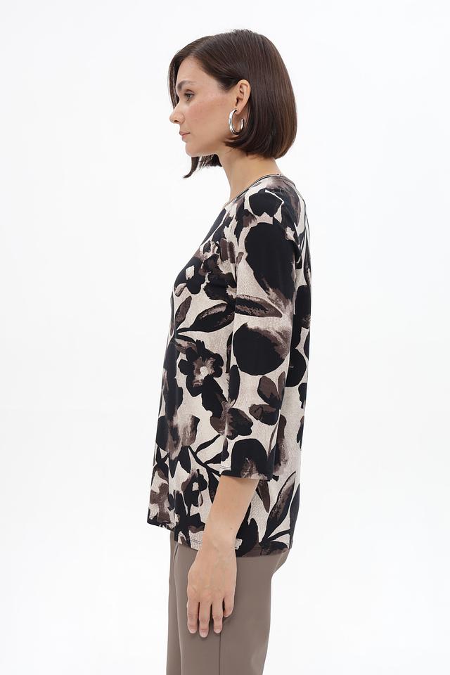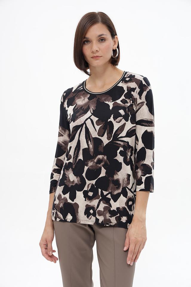 Блуза имеет круглый вырез горловины и рукава длиной 3/4, что делает ее универсальной для разных сезонов. Свободный крой обеспечивает комфорт в носке и позволяет создать расслабленный силуэт.