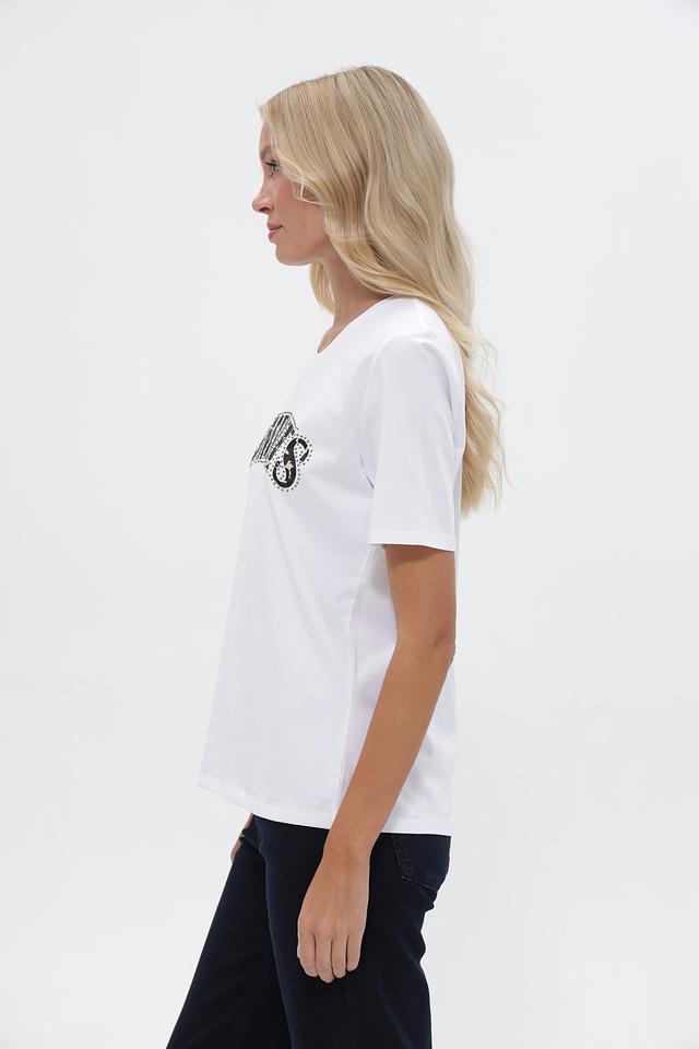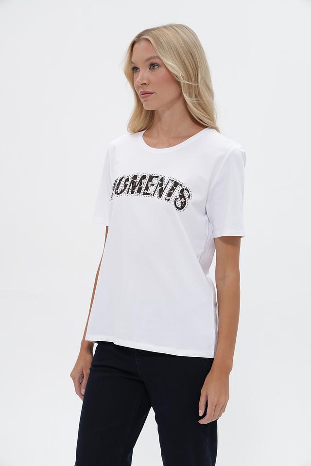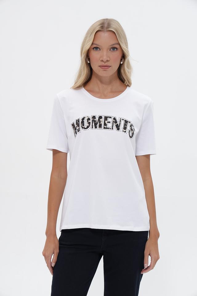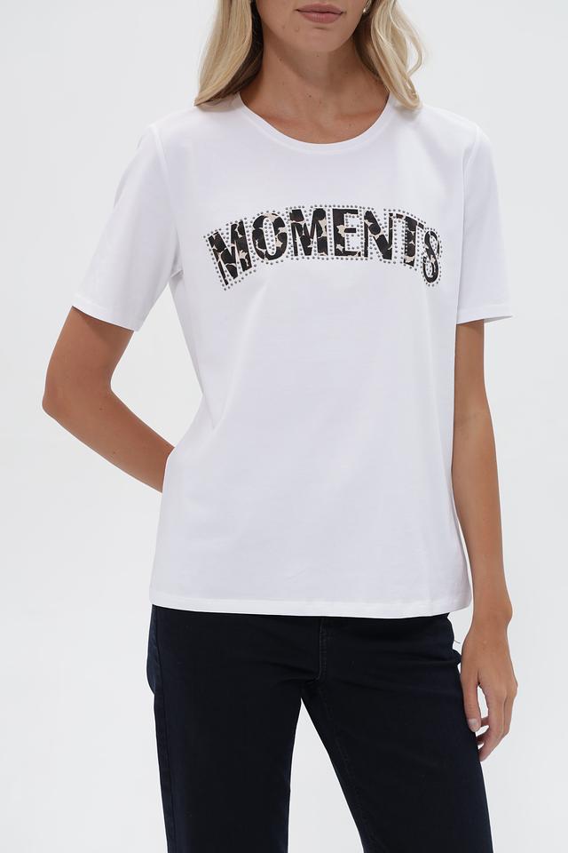 Основной цвет футболки – белый. Передняя часть украшена эффектной надписью “MOMENTS”, выполненной черным цветом и декорированной стразами, что придает изделию стильный и запоминающийся вид.
