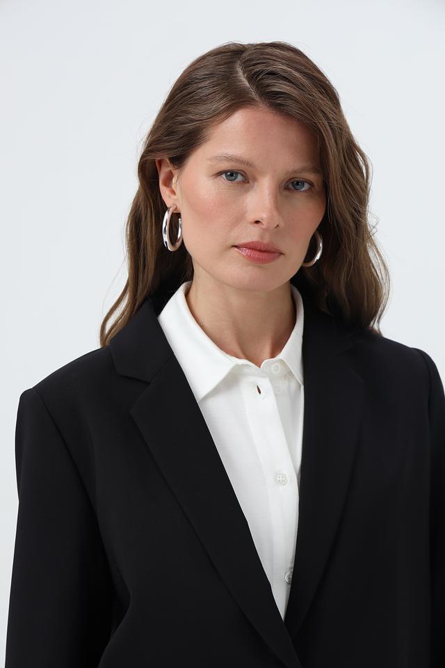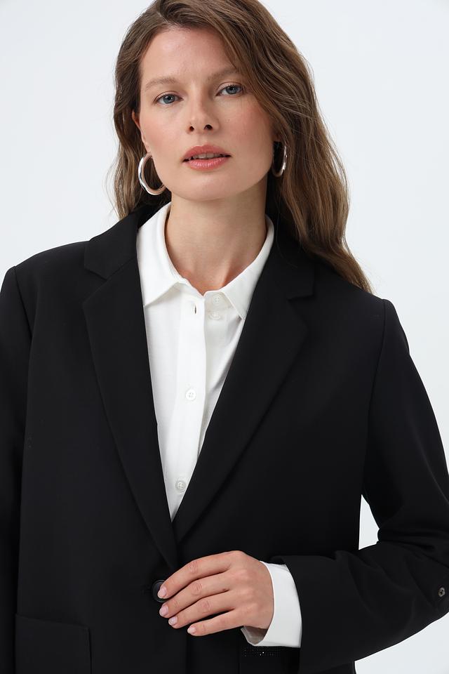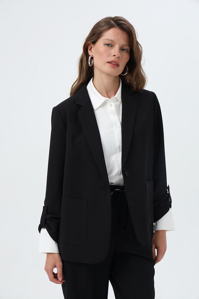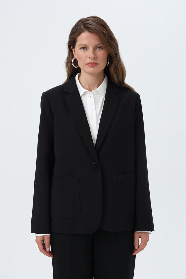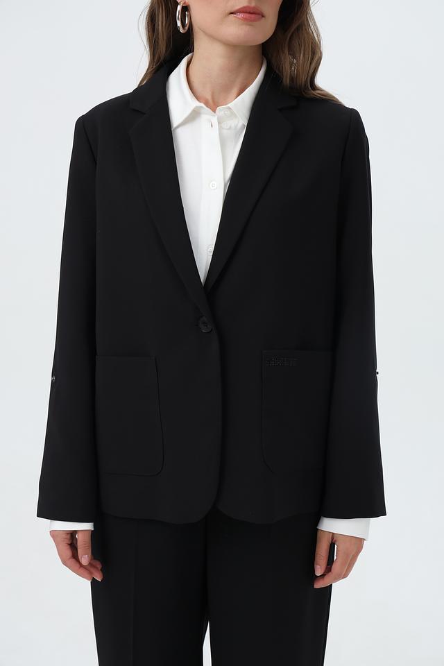 Жакет застегивается на одну пуговицу, имеет лацканы и два накладных кармана. Длинные рукавы дополняют элегантный силуэт.
