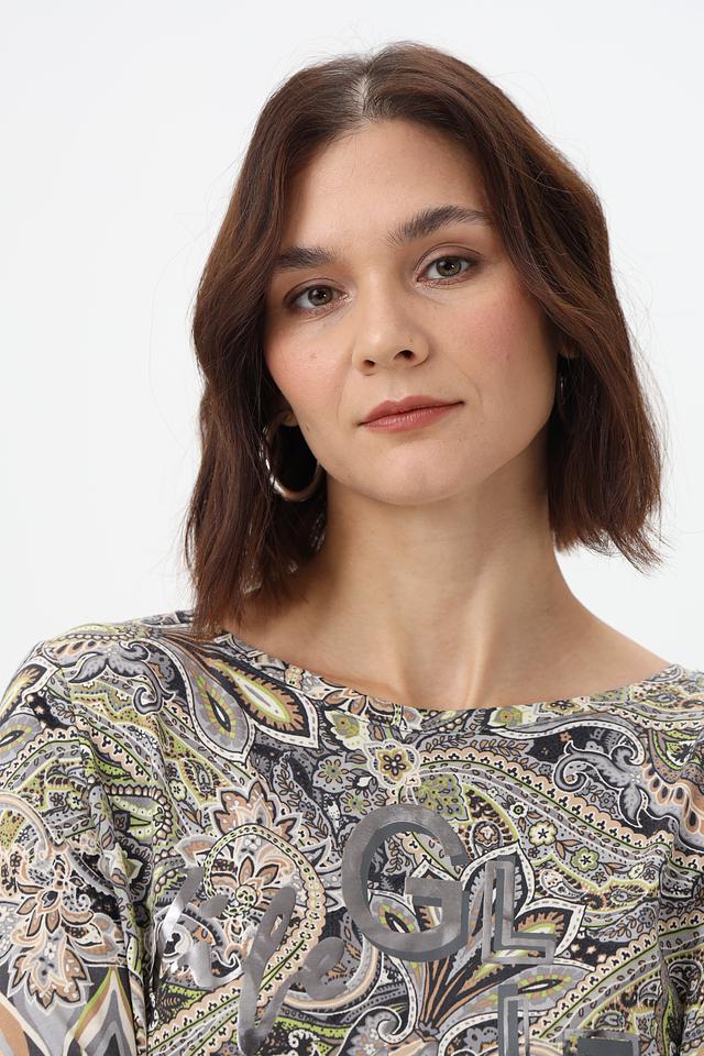 Блуза имеет удобный круглый вырез горловины и рукав длиной три четверти, что делает ее подходящей для различных случаев. Свободный крой обеспечивает комфорт в носке и позволяет создавать непринужденные образы.