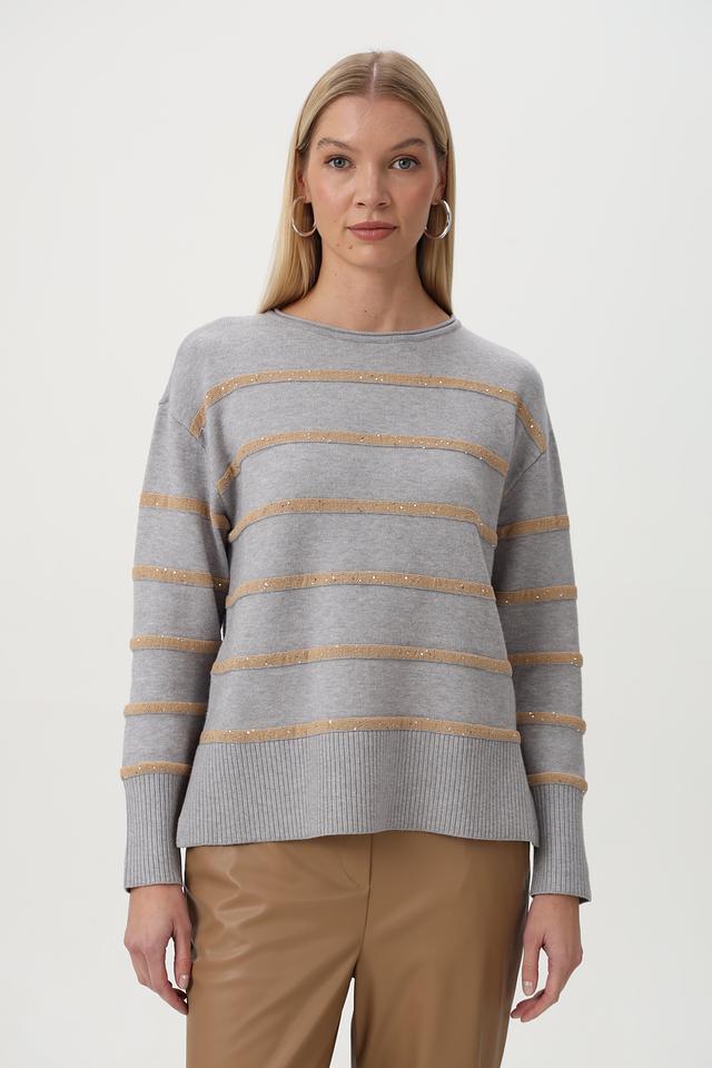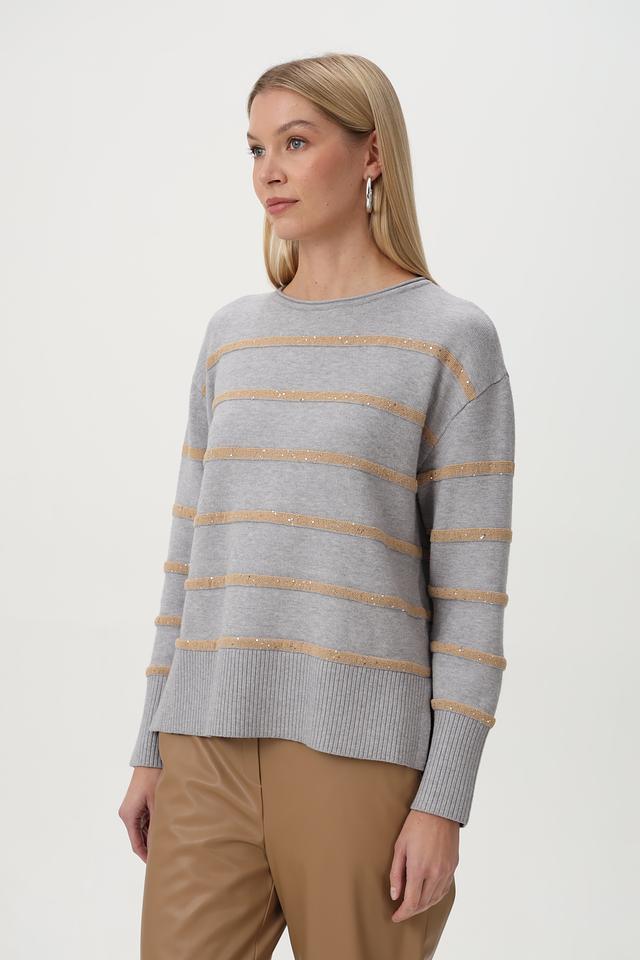 Пуловер имеет прямой крой и длинные рукава, а также круглый вырез горловины. Особый акцент сделан на горизонтальные полоски, которые украшены золотистой отделкой, придающей изделию изысканность и блеск.