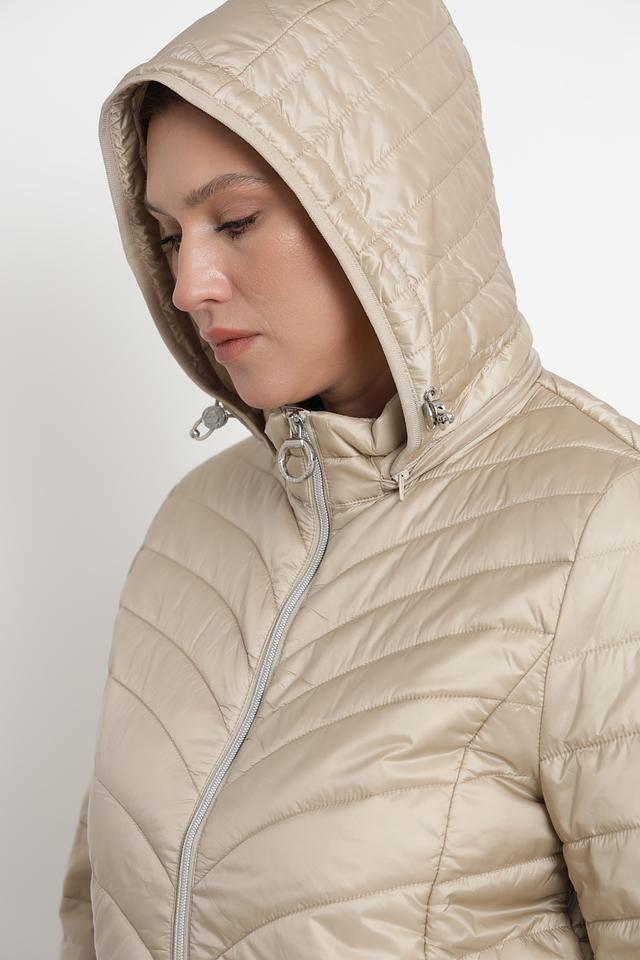 Модель имеет удобный капюшон, который защитит от непогоды, а застежка-молния обеспечивает надежную фиксацию. Куртка имеет слегка приталенный силуэт, который подчеркивает фигуру. Особенностью дизайна являются горизонтальные стежки, создающие эффектный визуальный образ.