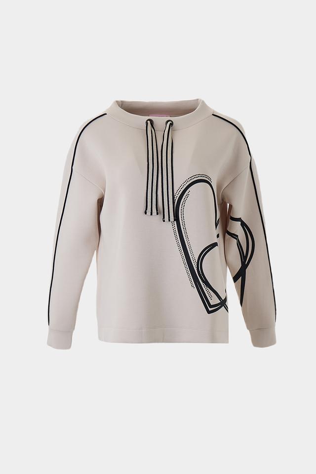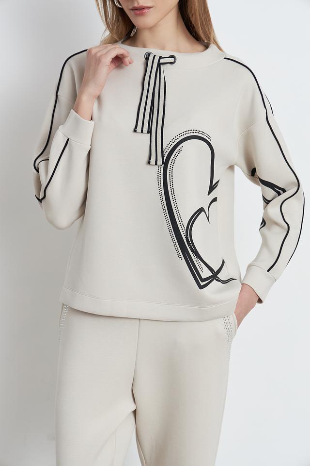 Пуловер имеет бежевый цвет и украшен оригинальным графичным рисунком в чёрном цвете. Декор выполнен в виде абстрактных линий и фигур, что придает изделию современный и модный вид. Вырез горловины округлый, а длинные рукава дополнены манжетами.