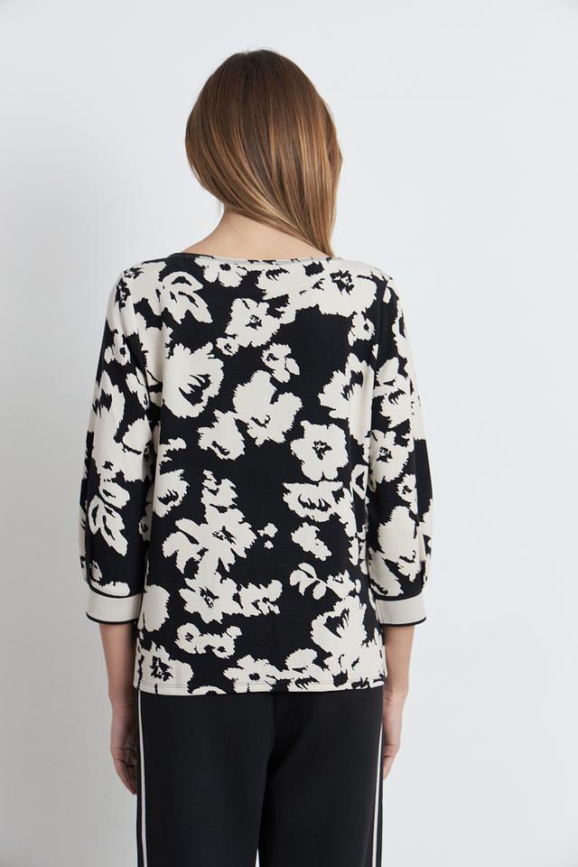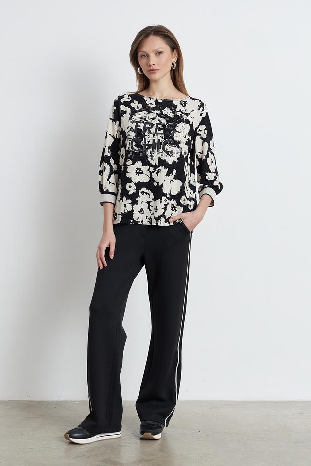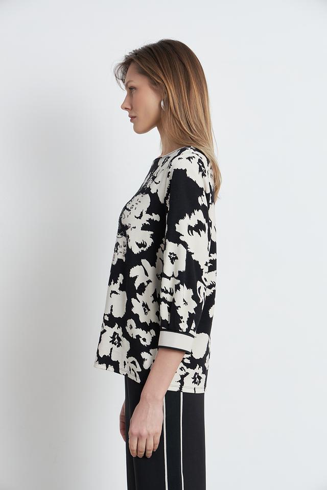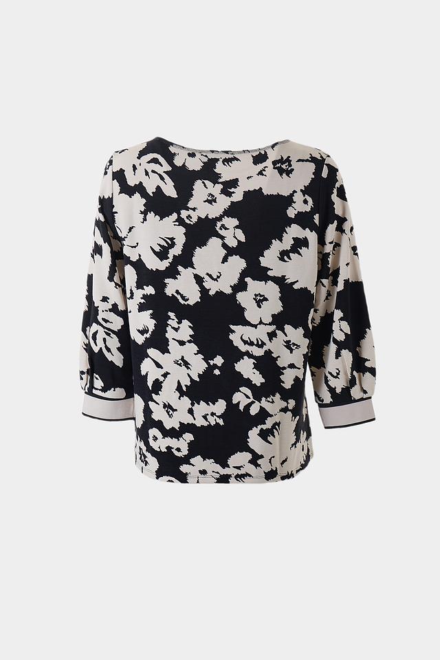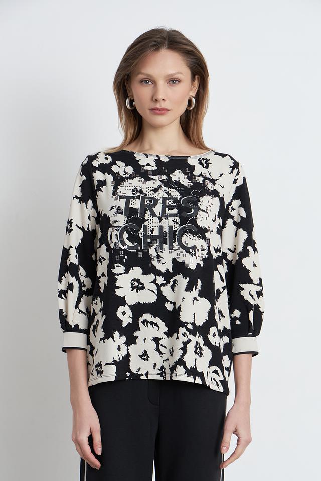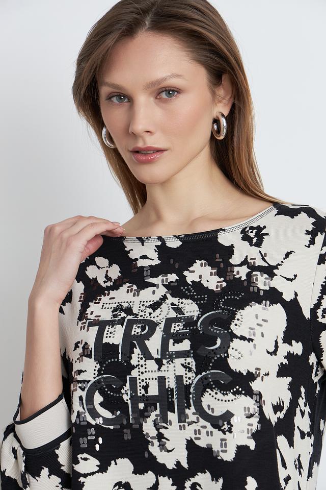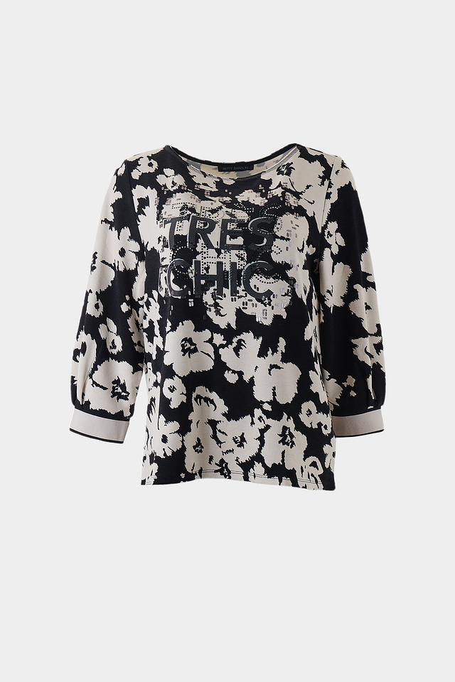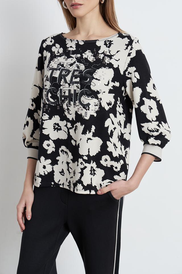 Женский пуловер Betty Barclay чёрно-белого цвета с ярким цветочным принтом и надписью. Модель с рукавом 3/4 и округлым вырезом горловины станет отличным дополнением к вашему гардеробу. Состав: вискоза 73%, полиэстер 23%, эластан 4%