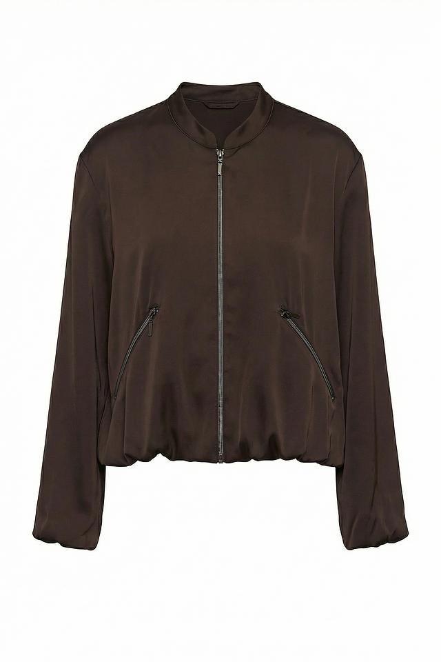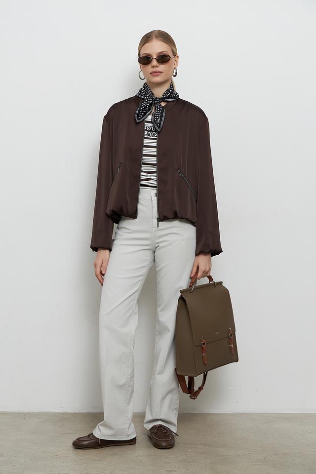 Модель имеет классический крой бомбера с застёжкой на молнию и воротником-стойкой. Боковые карманы на молнии добавляют функциональности и стиля.