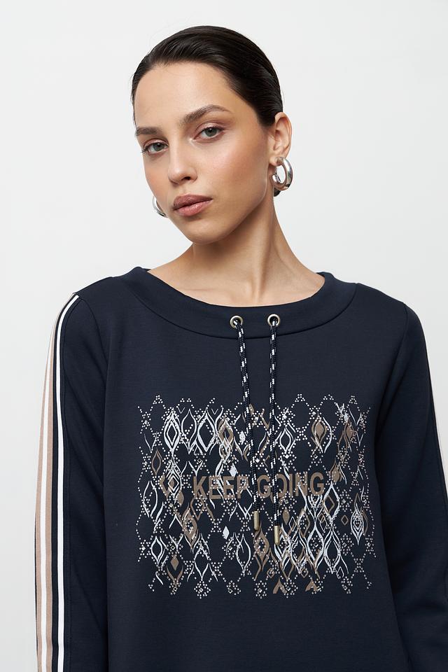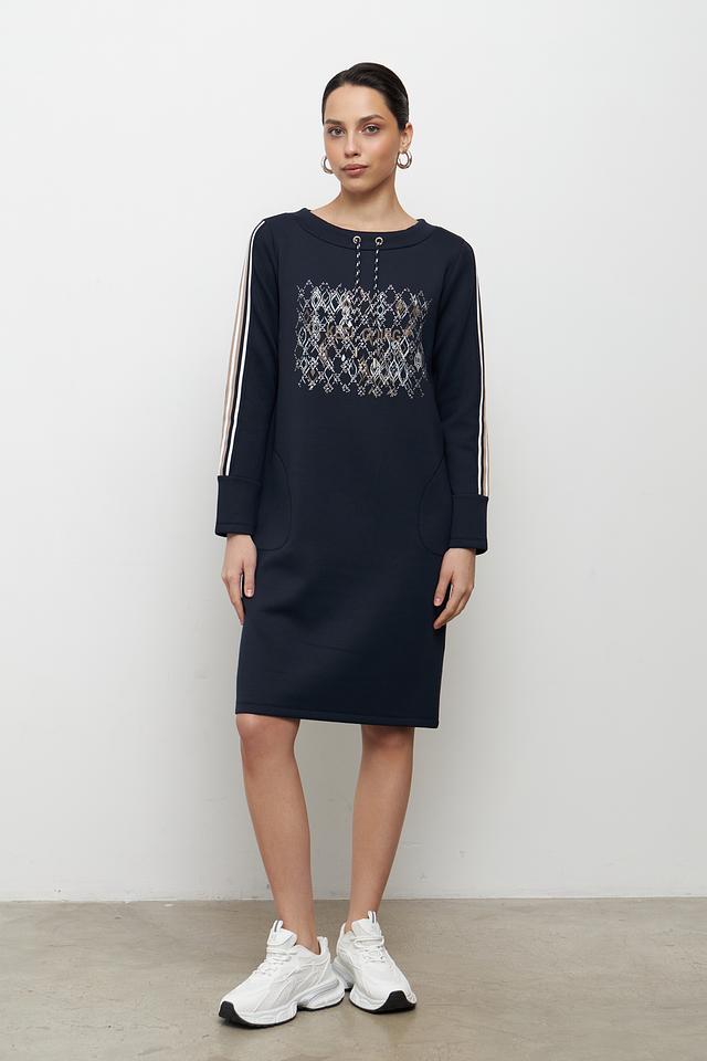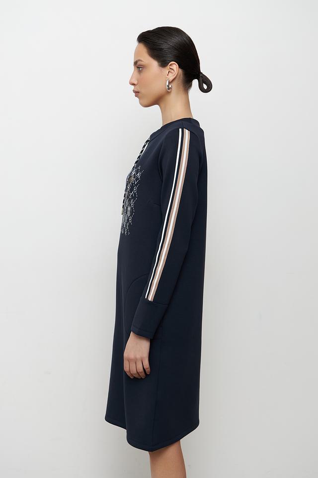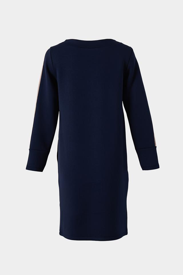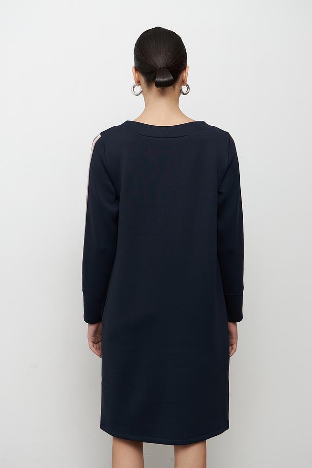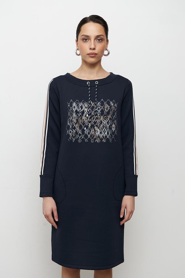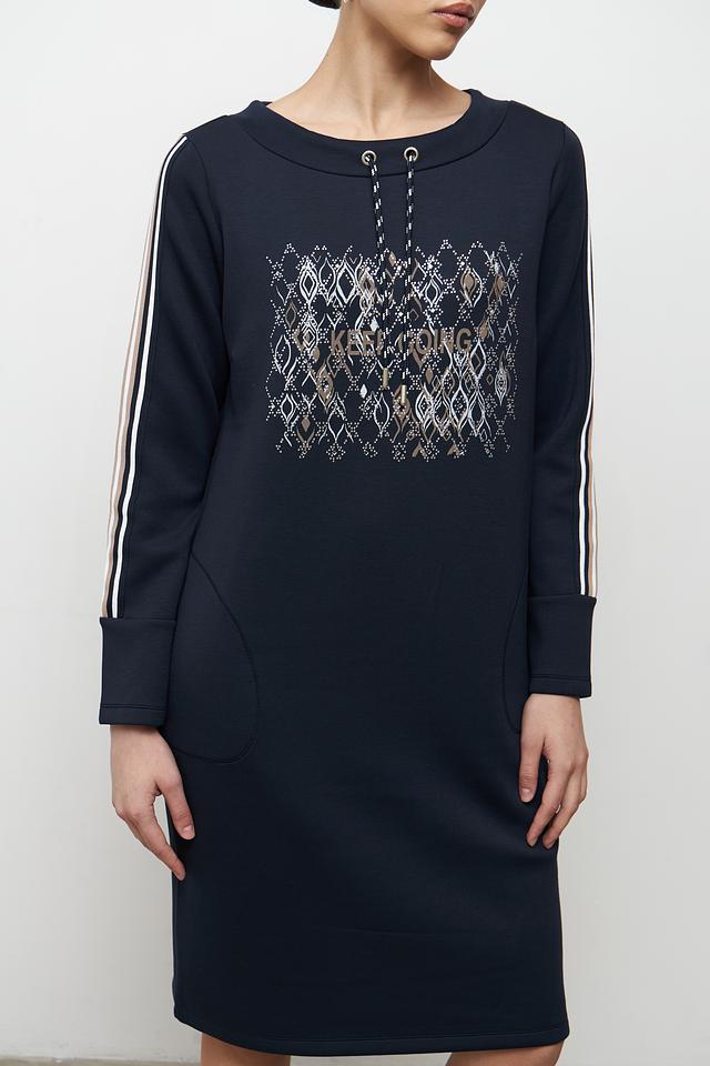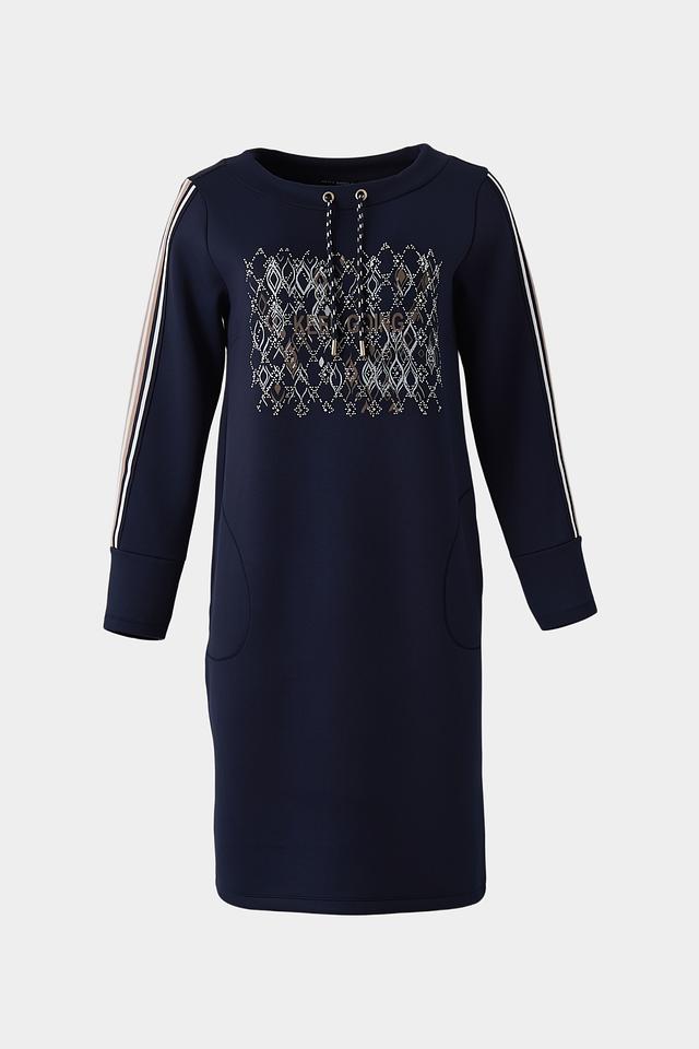 Платье от Betty Barclay темно-синего цвета, украшенное золотистым узором, выполнено из мягкой вискозы с добавлением полиэстера и эластана. Модель имеет удобный крой с карманами и декоративными шнурками на горловине. Состав: вискоза 76%, полиэстер 18%, эластан 6%