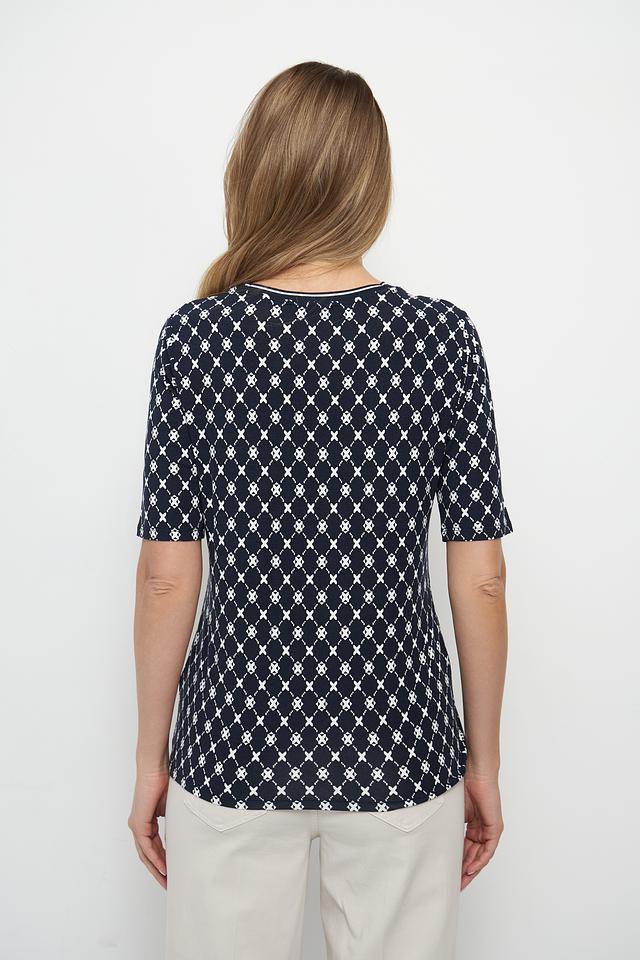 Футболка имеет классический крой с короткими рукавами и круглым вырезом горловины. Её отличает оригинальный принт в виде геометрической клетки, выполненной в белом цвете на темно-синем фоне. Этот узор добавляет образу изысканности и элегантности.