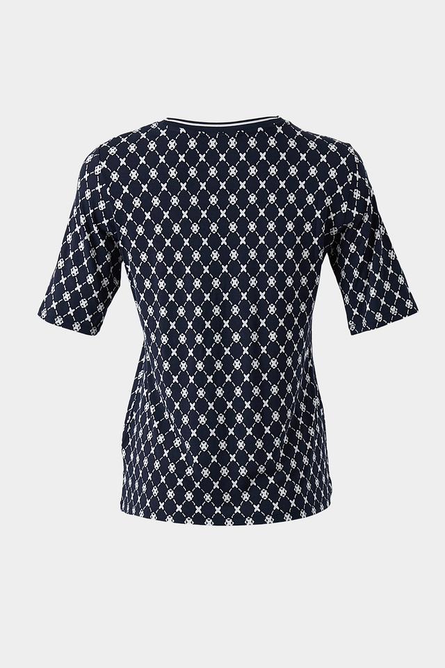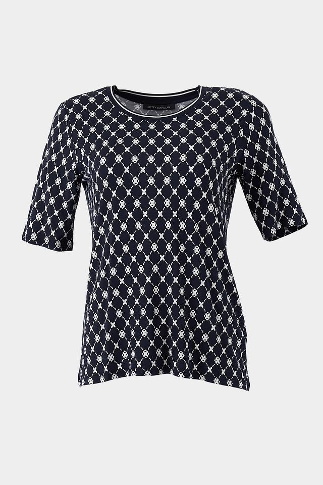 Женская футболка Betty Barclay темно-синего цвета с геометрическим принтом в белую клетку. Модель с короткими рукавами и круглым вырезом горловины выполнена из мягкой вискозы с добавлением эластана. Состав: вискоза 95%, эластан 5%