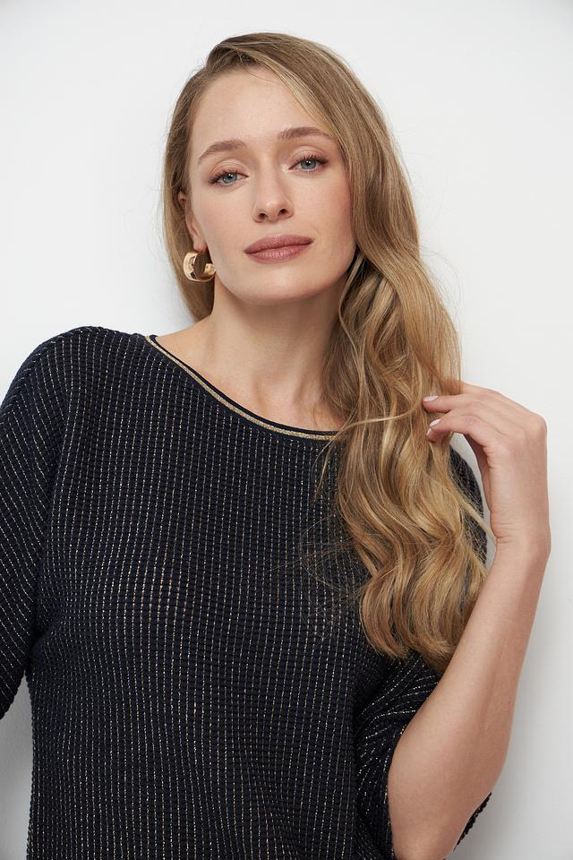 Этот пуловер от Betty Barclay – идеальный выбор для создания элегантного и комфортного образа. Пуловер выполнен в чёрном цвете с вертикальной полоской, что придает ему изысканность и визуальную легкость.