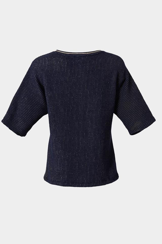 Модель имеет короткие рукава и свободный крой, обеспечивающий свободу движений. Вырез горловины округлый, что делает пуловер универсальным и подходящим для различных типов внешности.