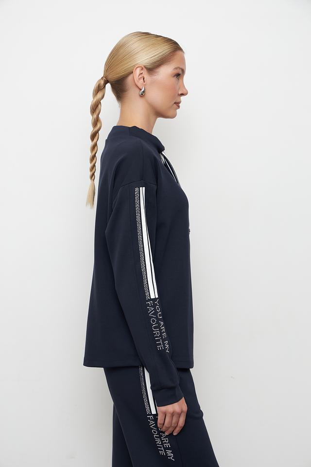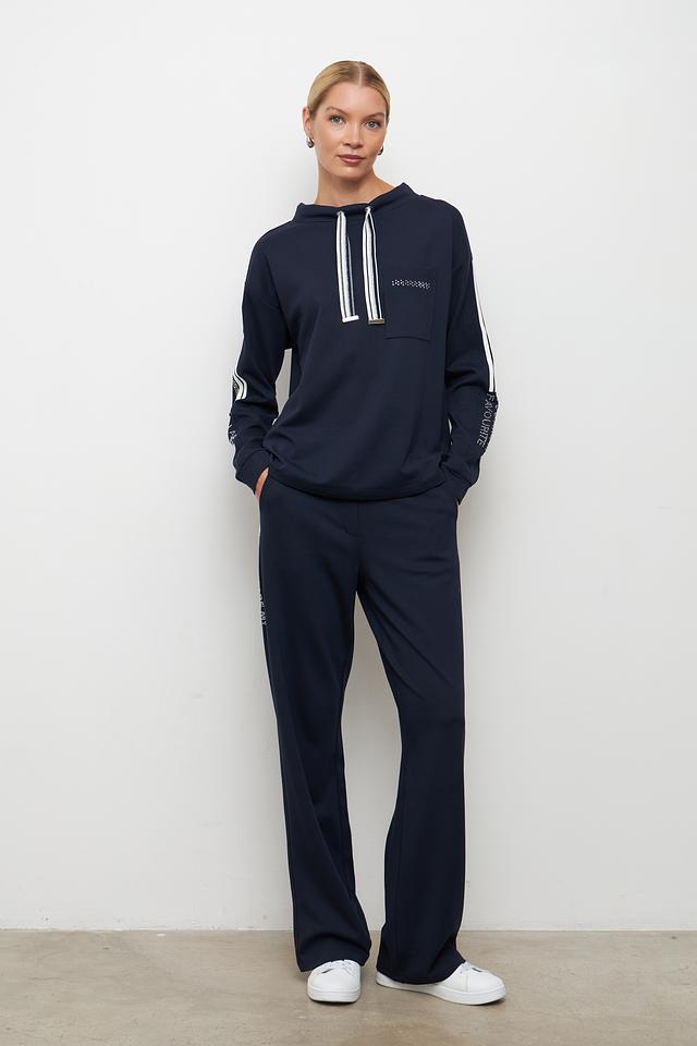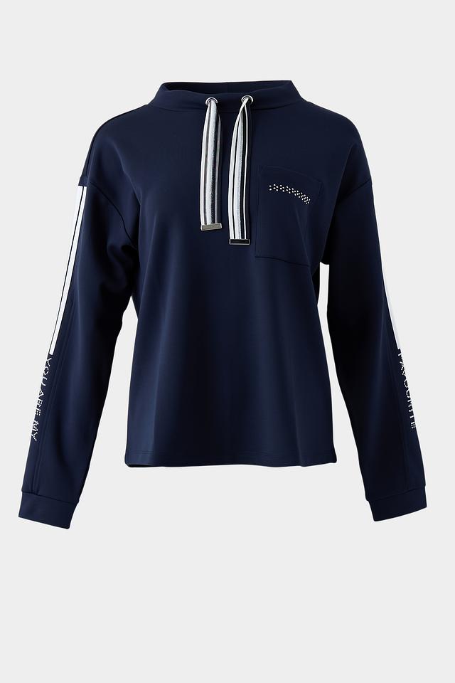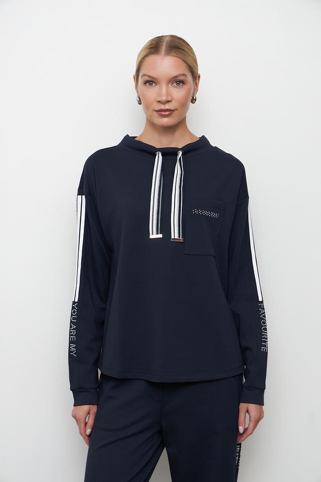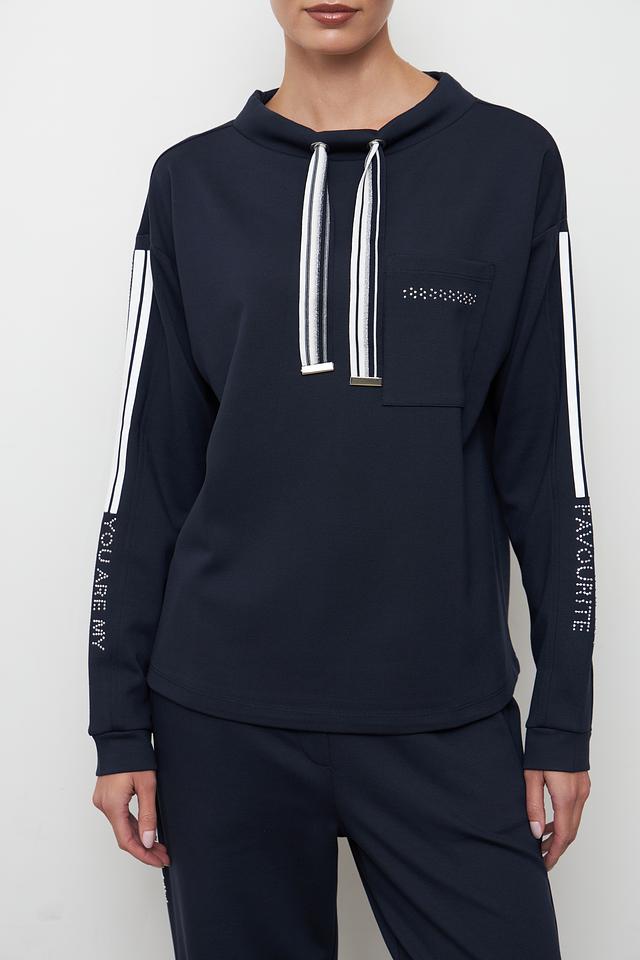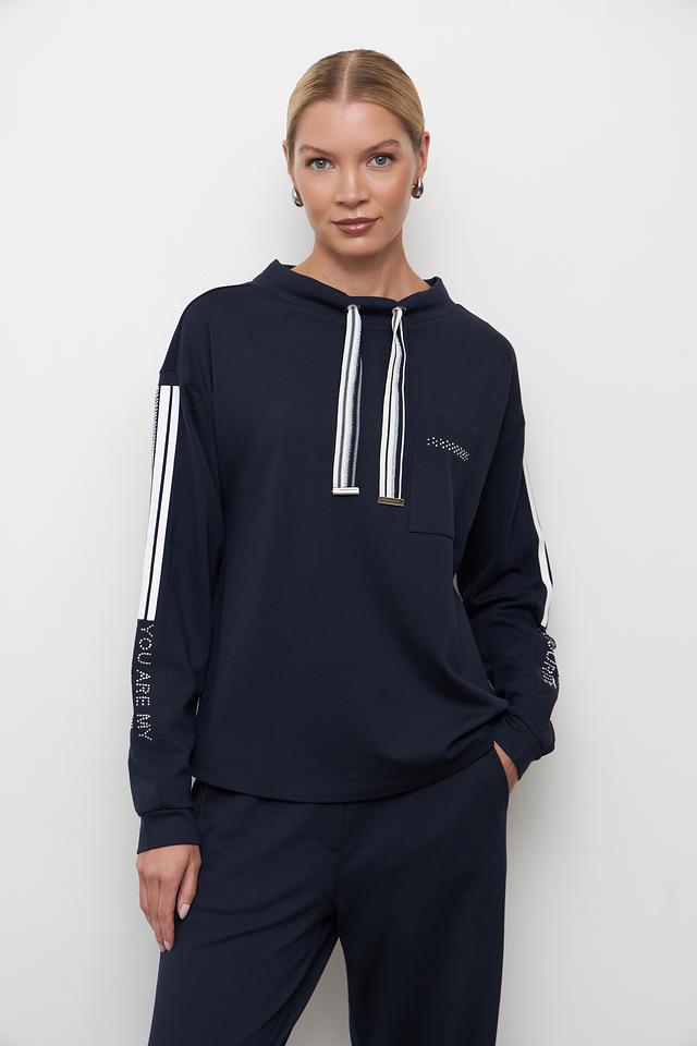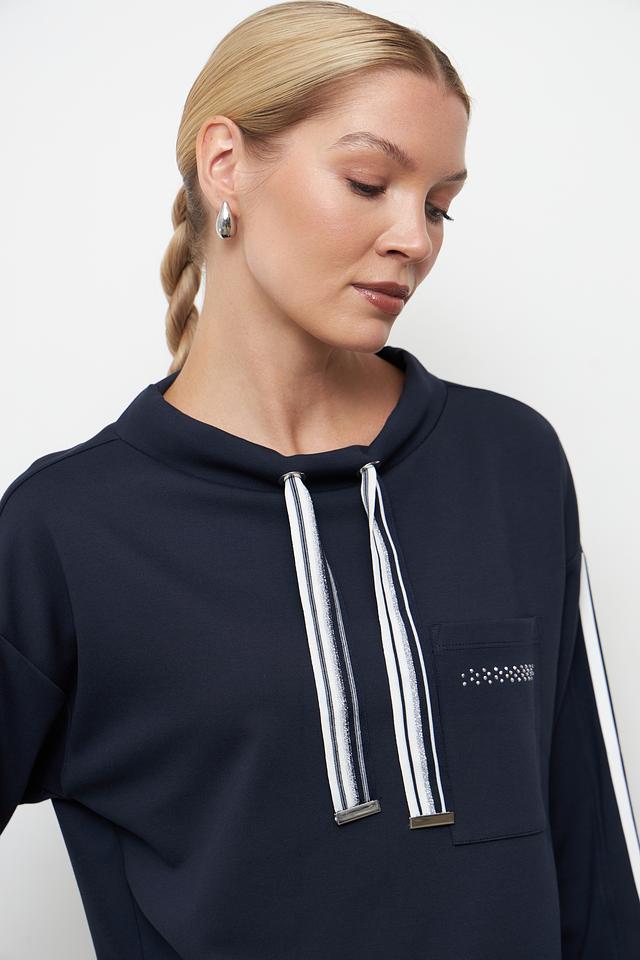 Тёмно-синий пуловер от Betty Barclay с белыми полосками и капюшоном. Модель выполнена из мягкого трикотажа с добавлением вискозы и эластана, обеспечивающего комфорт и свободу движений. Декорирован стразами. Состав: вискоза 70%, полиэстер 25%, эластан 5%